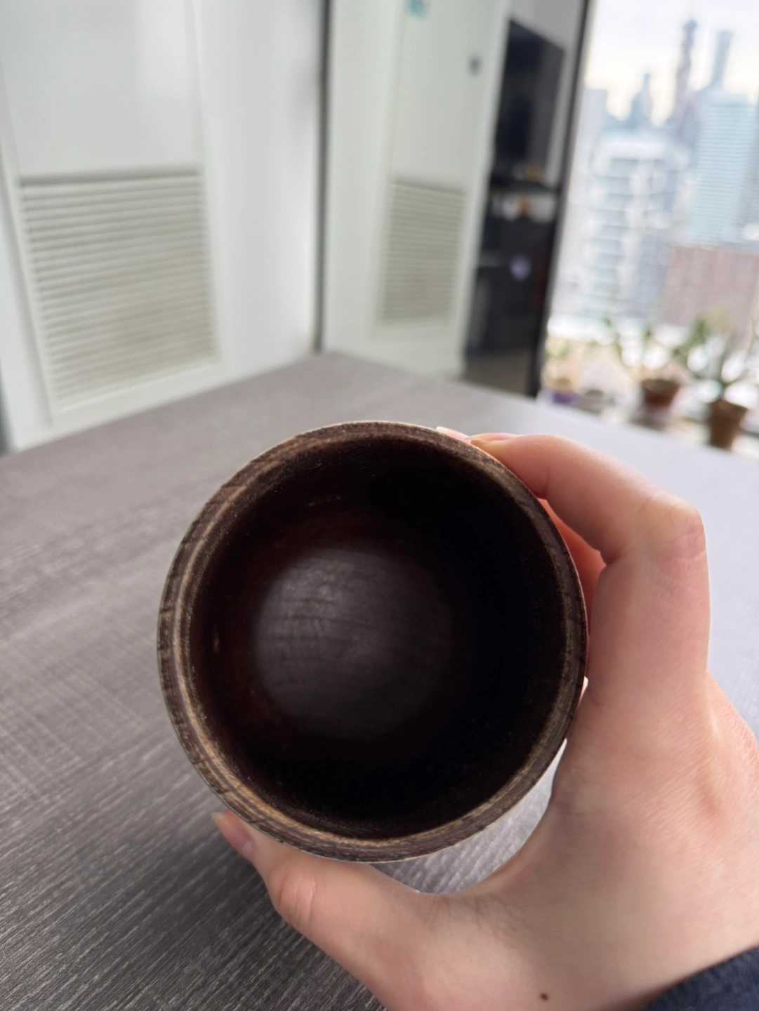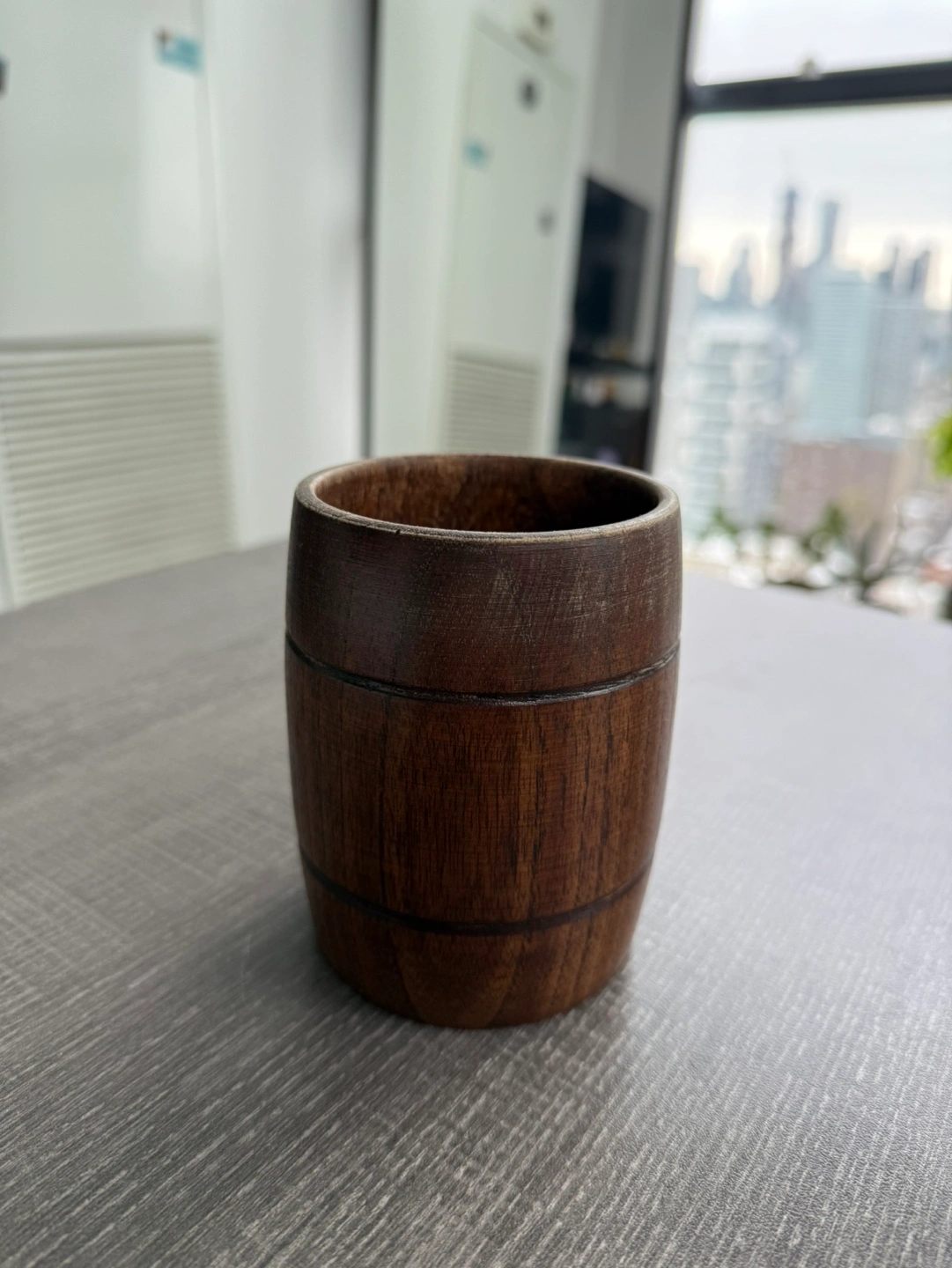 Small, dark brown wooden cup. Barrel-shaped design. Unique and charming. Perfect for small plants or trinkets.