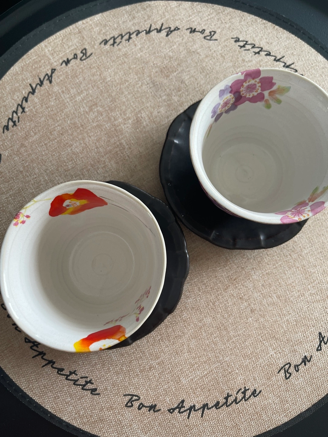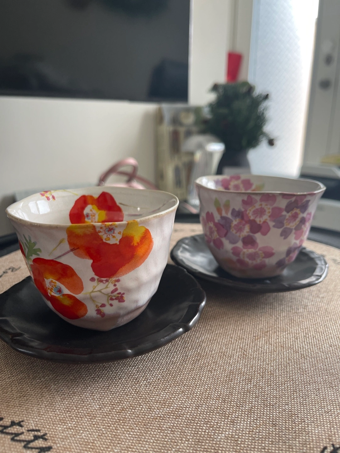 Pair of unique teacups teacups W9.5cm xH7cm saucers W12x12cm Featuring beautiful floral designs. Hand-painted style. Small and elegant. From Japan