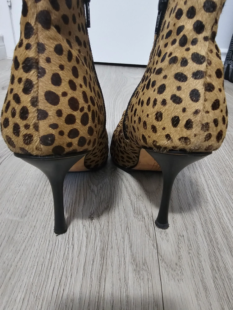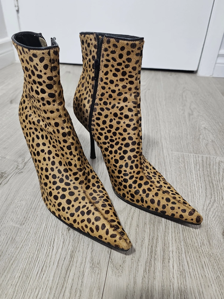Steve Madden ankle boots. Pointed-toe design. Leopard print. Zip closure. Stiletto heels.