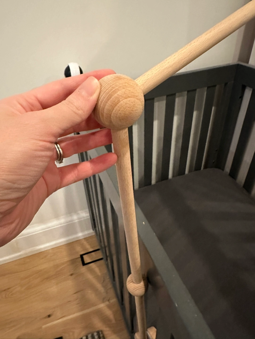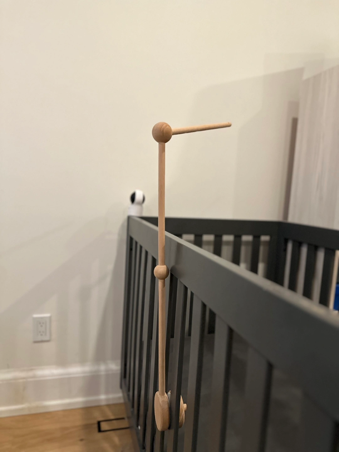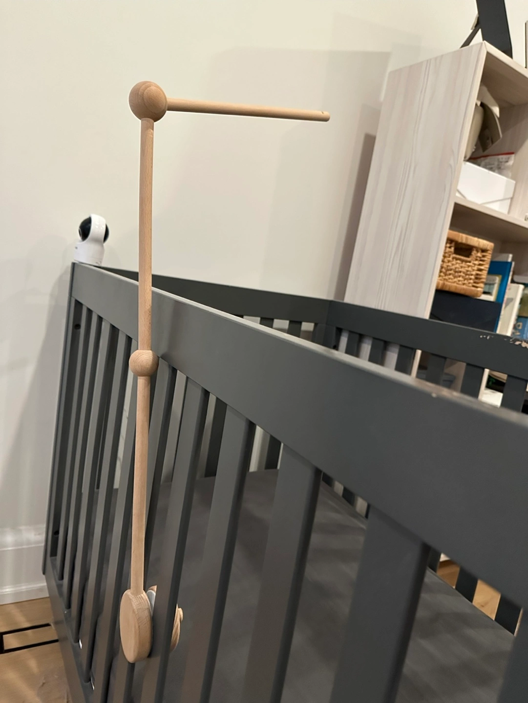 Simple wooden crib mobile arm. Attaches easily to crib rails. Features rounded wooden accents. Great for hanging mobiles.