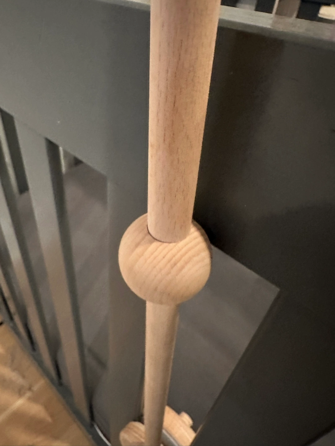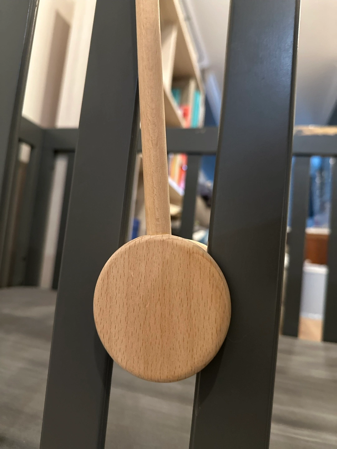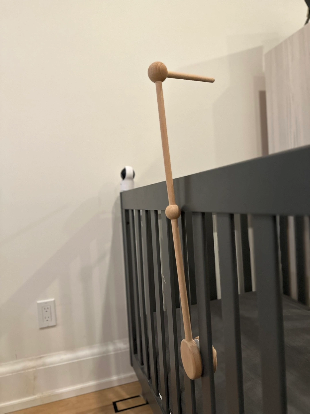 Simple wooden crib mobile arm. Attaches easily to crib rails. Features rounded wooden accents. Great for hanging mobiles.
