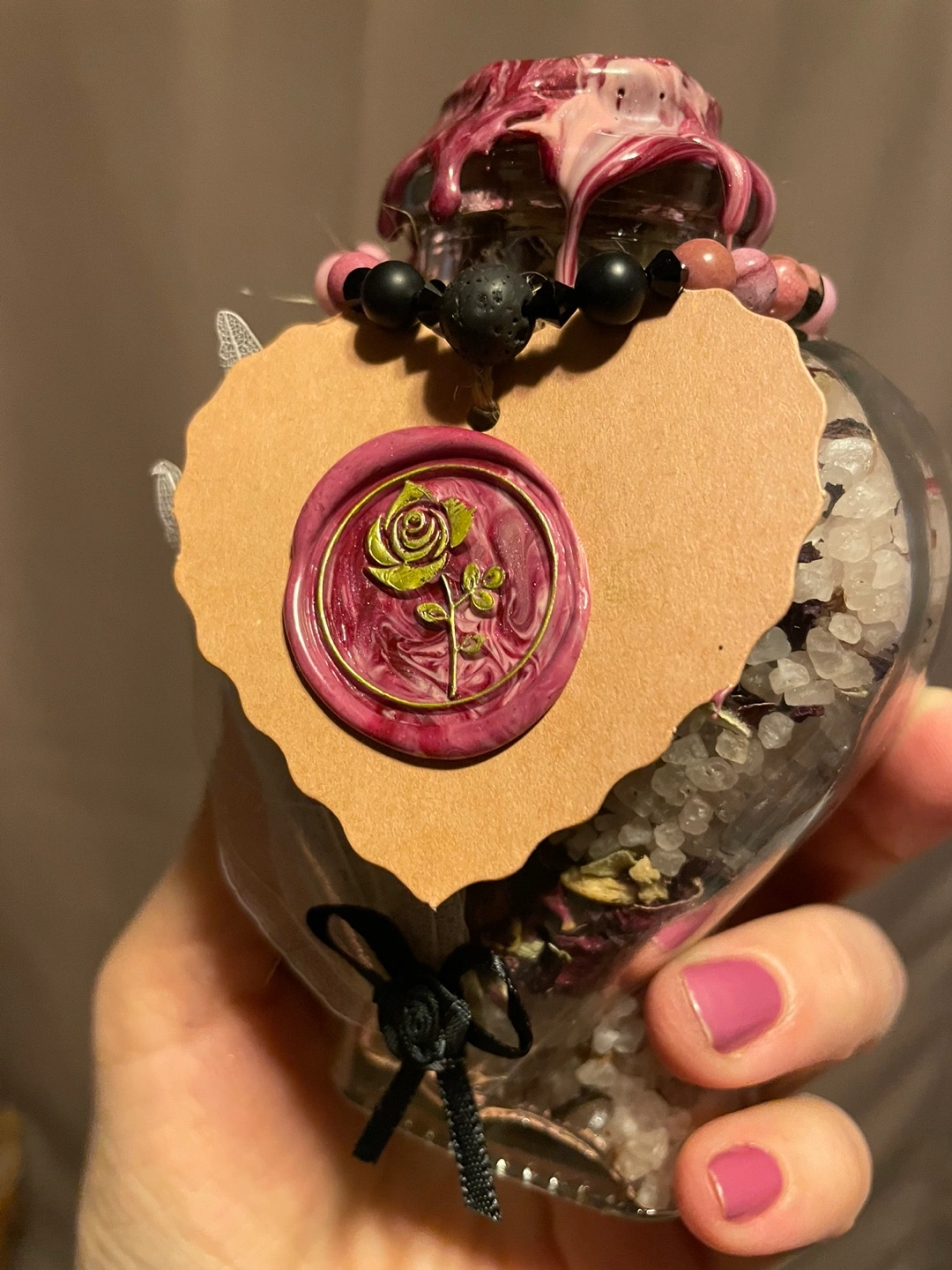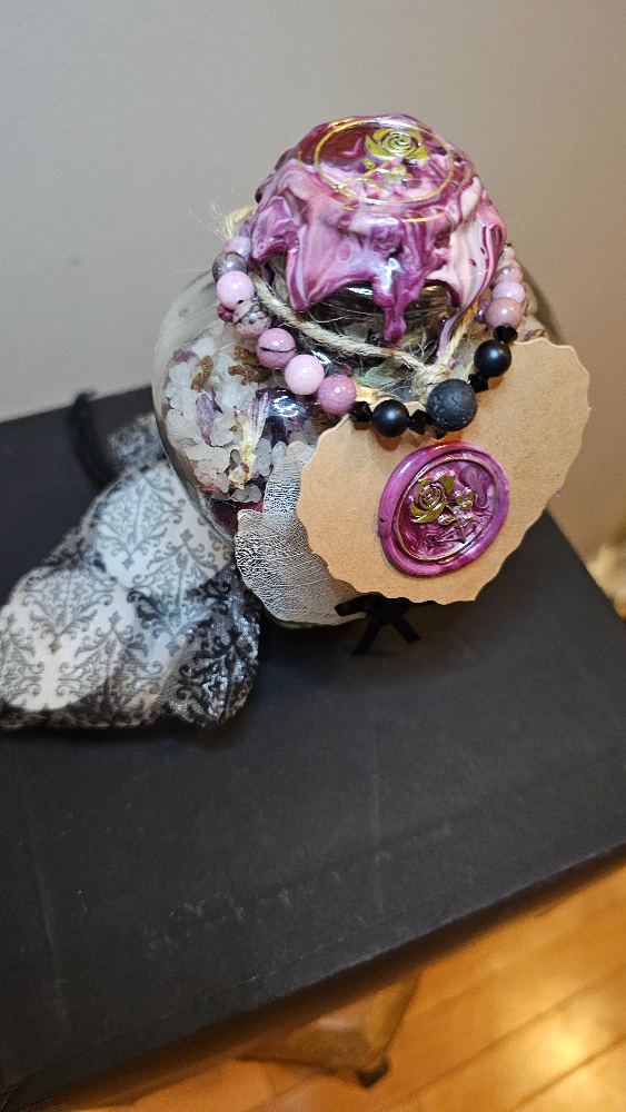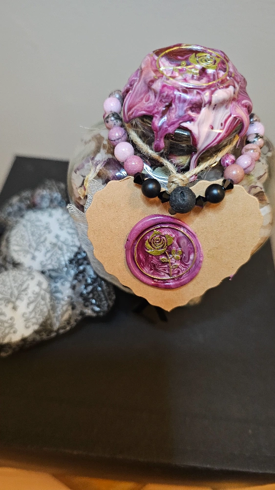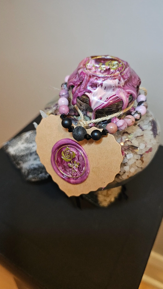 Sandalwood and rose bath salt/bath tea blend in a re-useable glass jar. Also comes with a special bracelet, 2 tealights, incense braids and bath tea bags. made by me :) *bracelet is made with black swarovski crystal, lava stone, matte onyx and rhodonite beads.