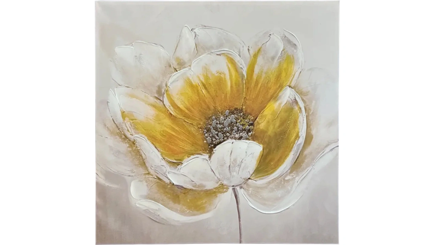 Clearing out Home Staging Inventory Beautiful textured canvas wall art. Features a large yellow and white flower. Neutral colours. Perfect for adding a touch of elegance to your home.