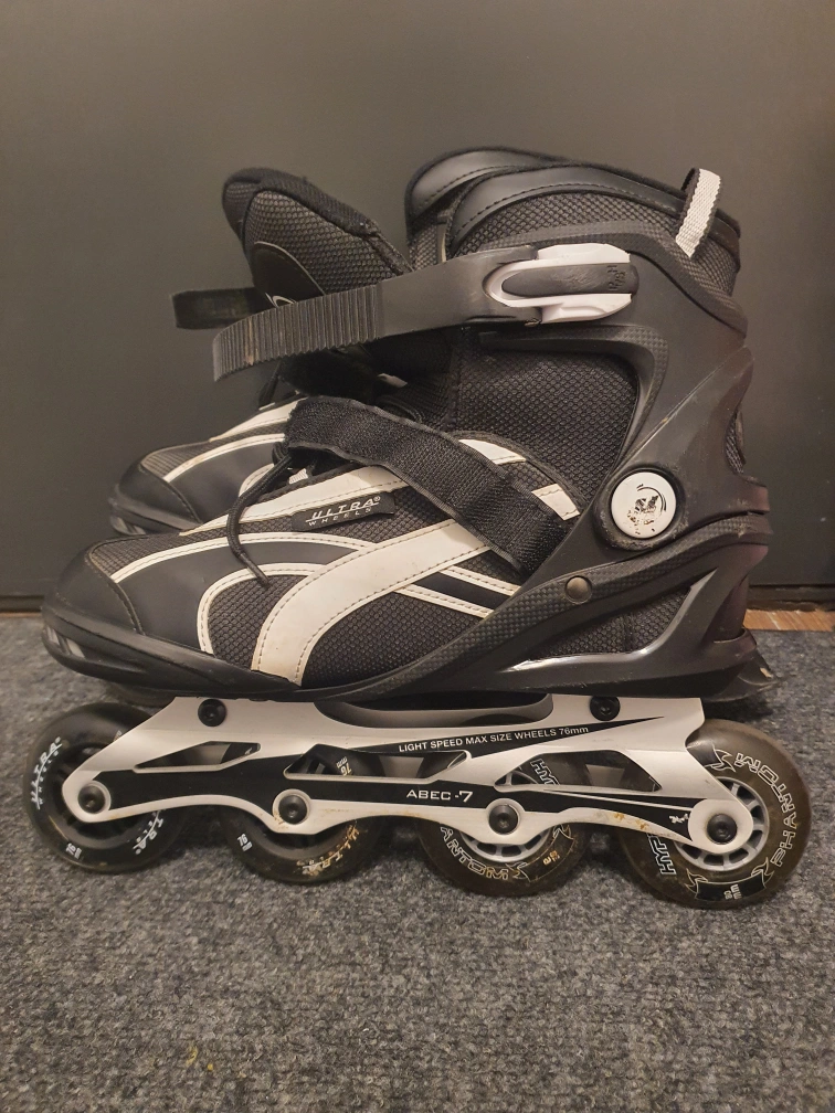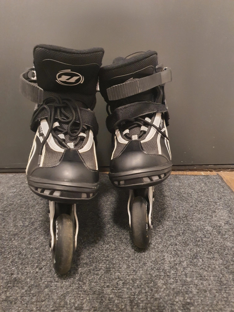 Black and grey inline skates.