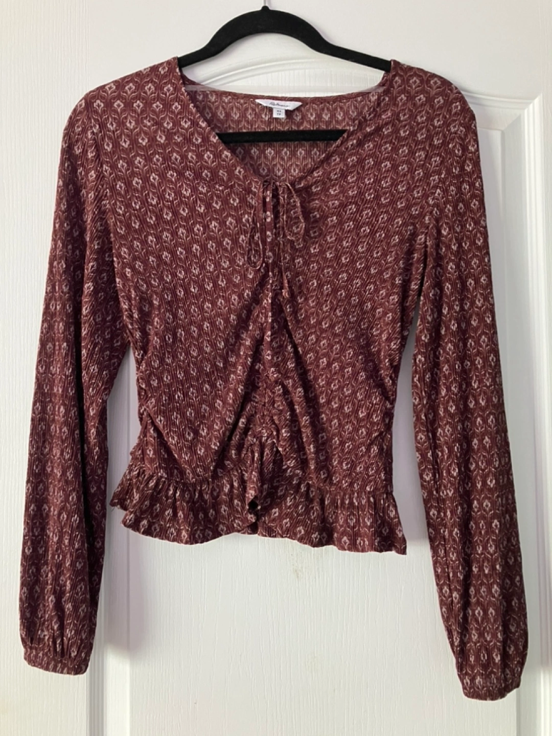 Long sleeve, maroon blouse with a cinched waist and ruffled hem. Size XS but fits more like a small/medium. Never worn except to try on! Can meet near the Eaton Centre, Queen subway, or Union station.