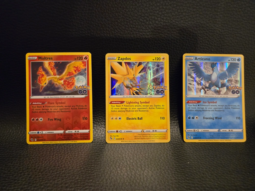Three Pokemon Go cards: Moltres, Zapdos, and Articuno. Each card is a basic Pokemon with 120 HP. Features unique abilities and attacks. Foil cards Mint condition. Never played
