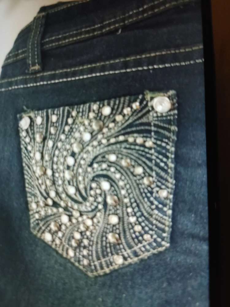 Women's dark wash jeans. Features a unique back pocket with rhinestone and embroidery detailing. Size and other details not visible.