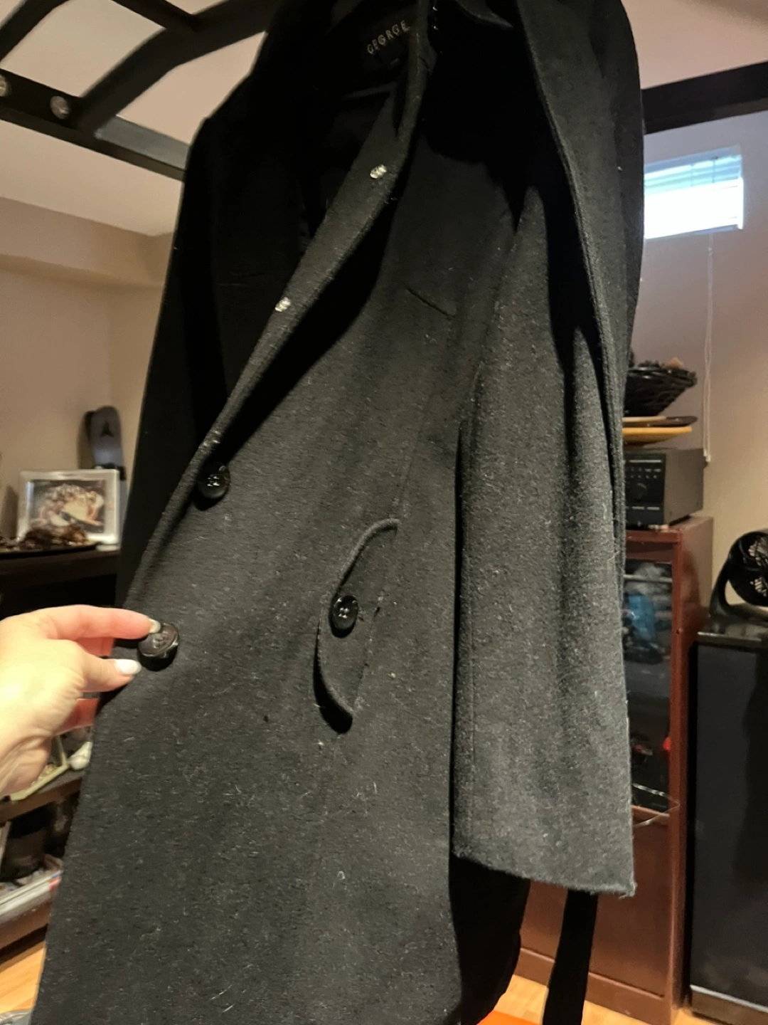 Women's black peacoat. Long sleeves, button closure. Good condition.