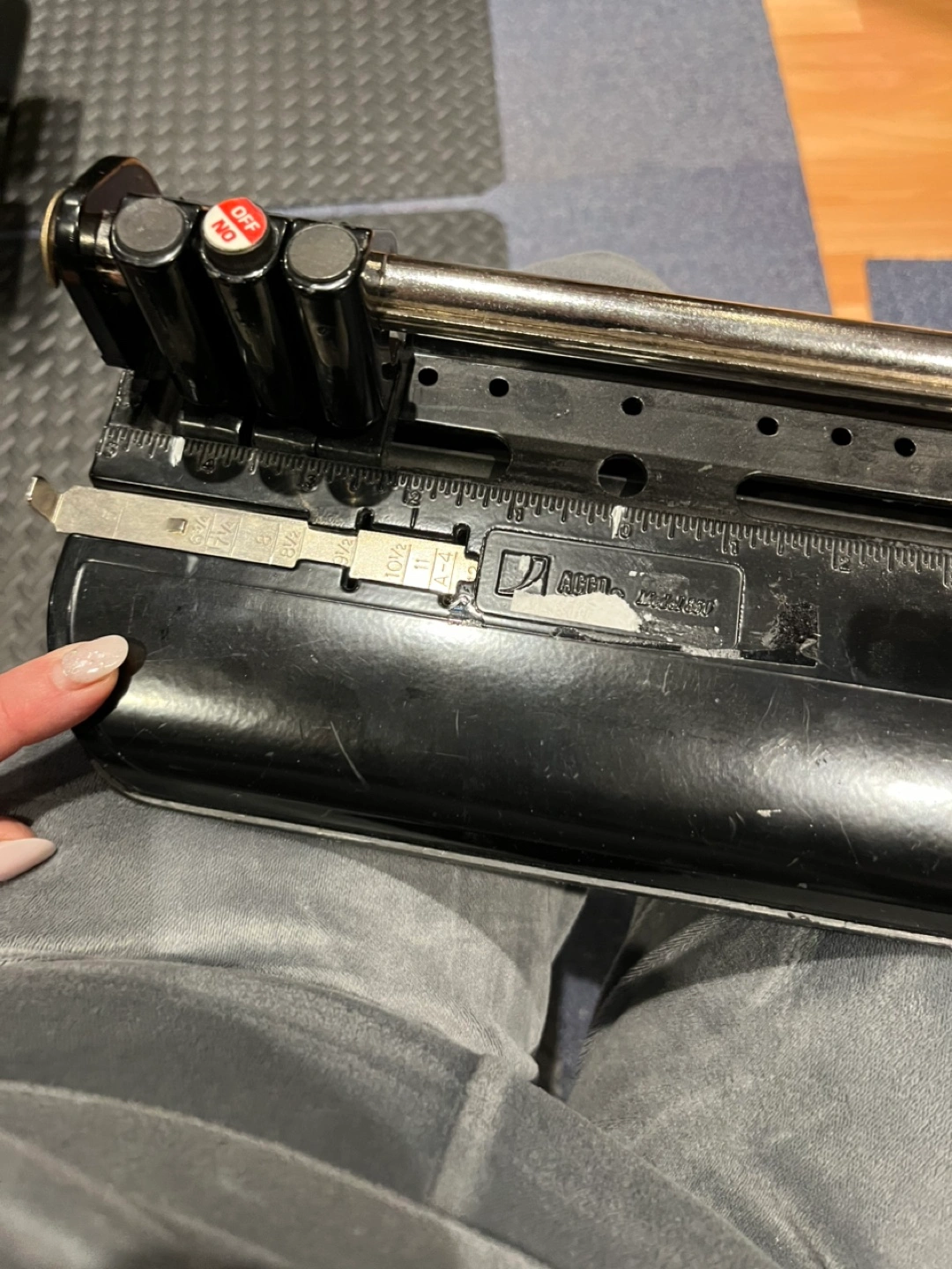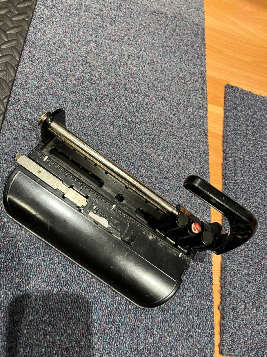 Vintage Challenge paper punch. Black plastic body. Metal cutting mechanism. Adjustable cutting depth. Includes ruler. Good condition.