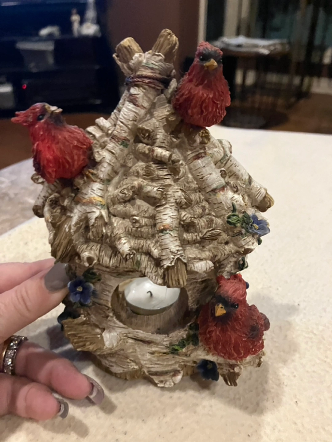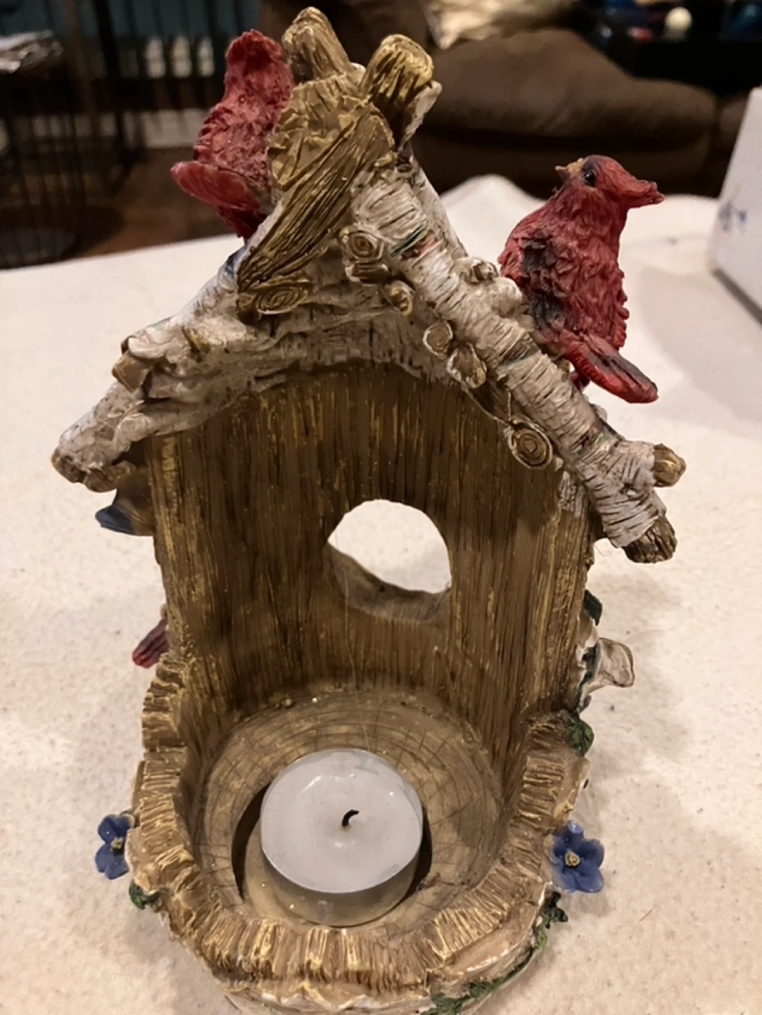 Adorable birdhouse tea light holder. Features three cardinals perched on a birch bark structure. Small and charming, cardinals are associated with holding close loved ones passed . Holds a standard tea light candle, approx 7”high. Cash only, p/up in Thornhill-Yonge St south of Hwy 7.