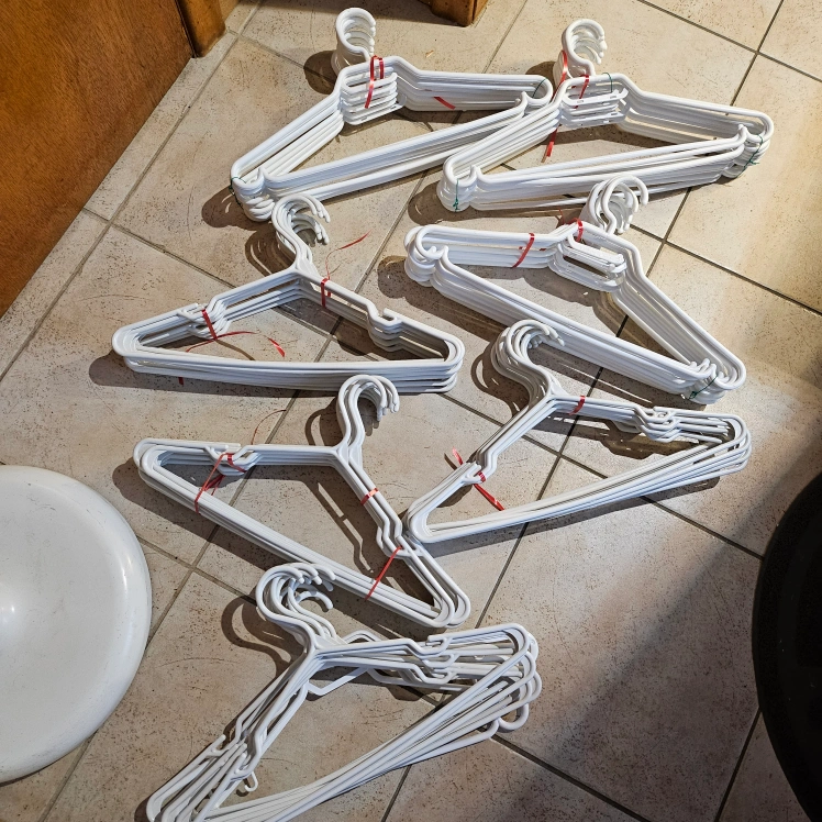 Large quantity of plastic hangers. Great for organizing closets or for resale. White colour. Sold as a bundle. $2.5 per dozen/set of 12. Must take them all 8 dozens.