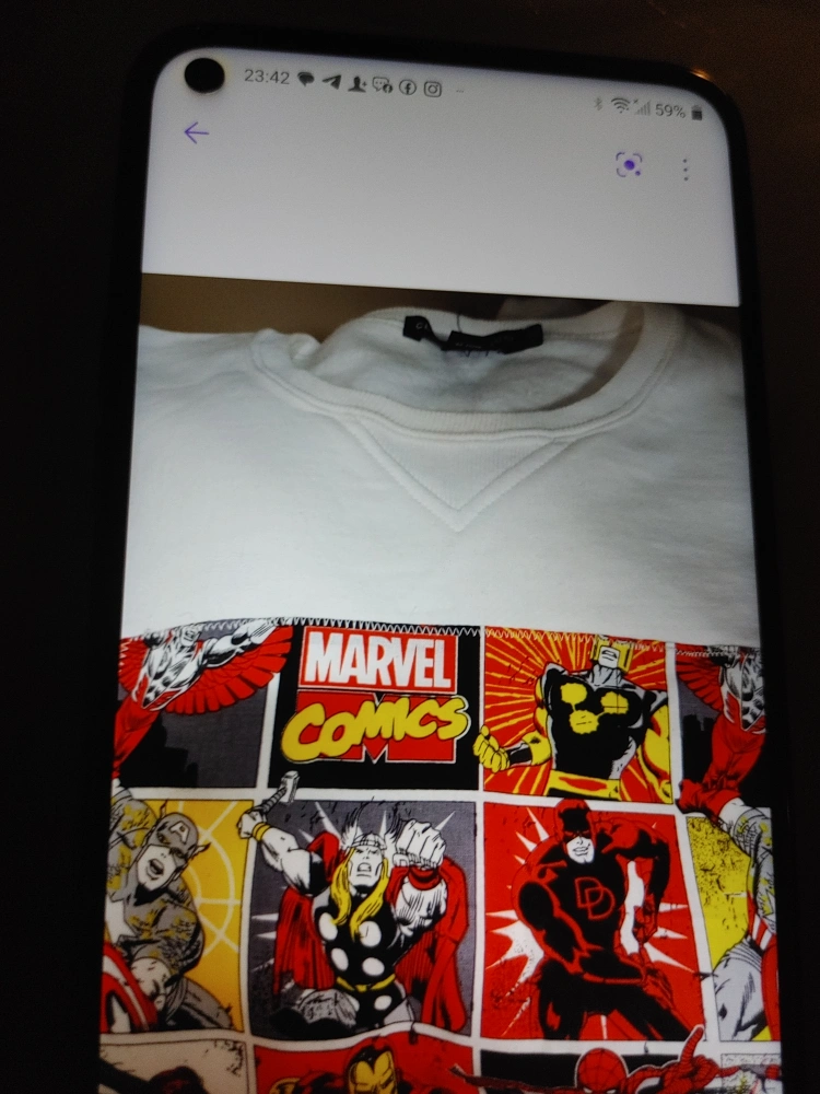 Youth-sized white sweatshirt. Features a colourful Marvel Comics graphic featuring various Marvel characters. Crew neck.