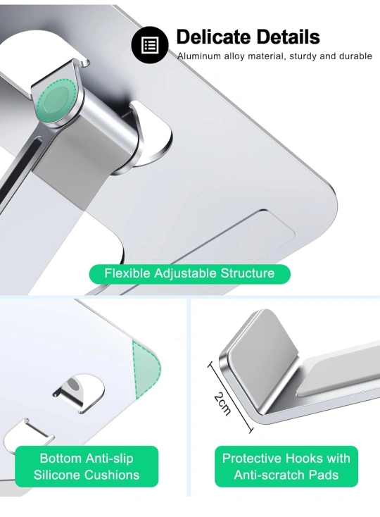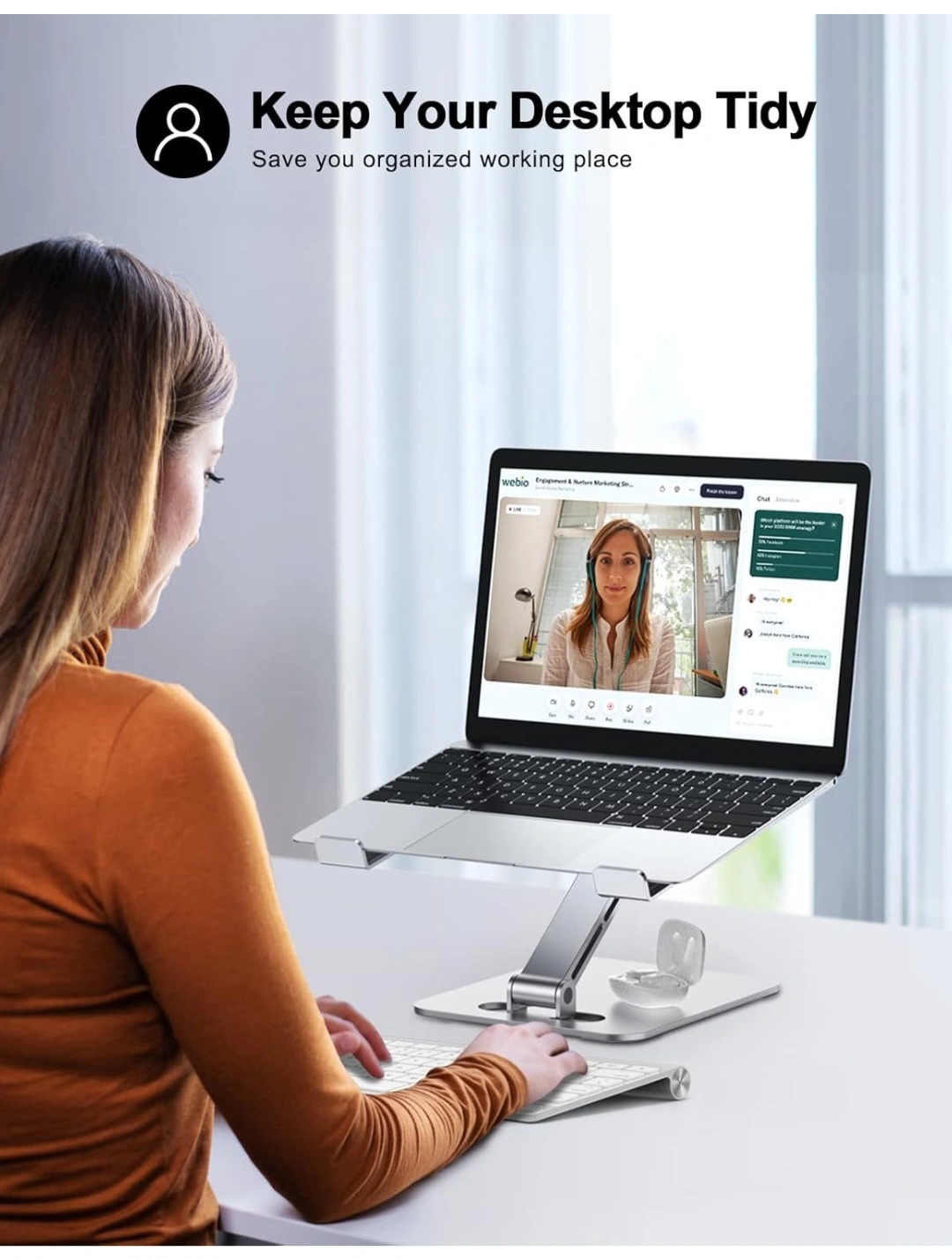 Brand New. Laptop Stand for Desk, Ergonomic Adjustable Foldable Computer Stand with Heat-Vent, Aluminium Alloy Laptop Riser Compatible with MacBook Air, Pro, Dell XPS, Samsung, 10”-16" Portable laptop stand. Aluminum alloy construction. Adjustable height and angle. Foldable design, easy to carry. Compatible with 10"-16" laptops. Includes anti-slip silicone cushions. Provides improved cooling.