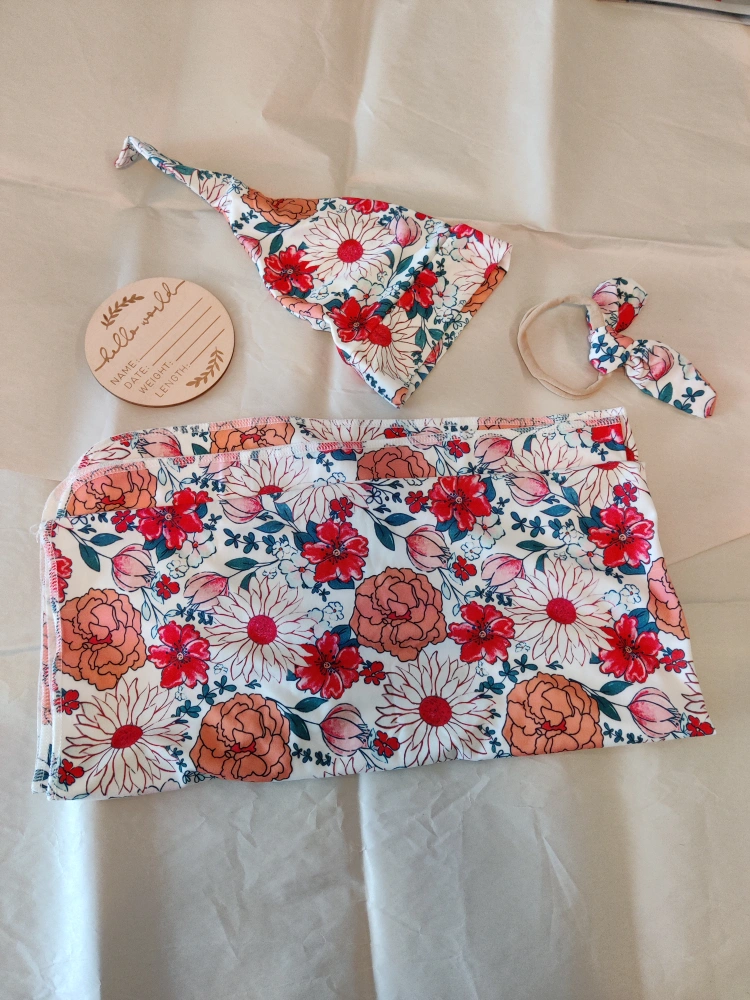 Adorable newborn outfit set. Includes a floral bonnet, matching headband, and a swaddling blanket. Perfect for photoshoots or everyday wear. Features a beautiful floral pattern in shades of red, peach, and teal. From a no pet non smoking home Meetup near Finch and Yonge Cash only Please check other listings on my profile :)