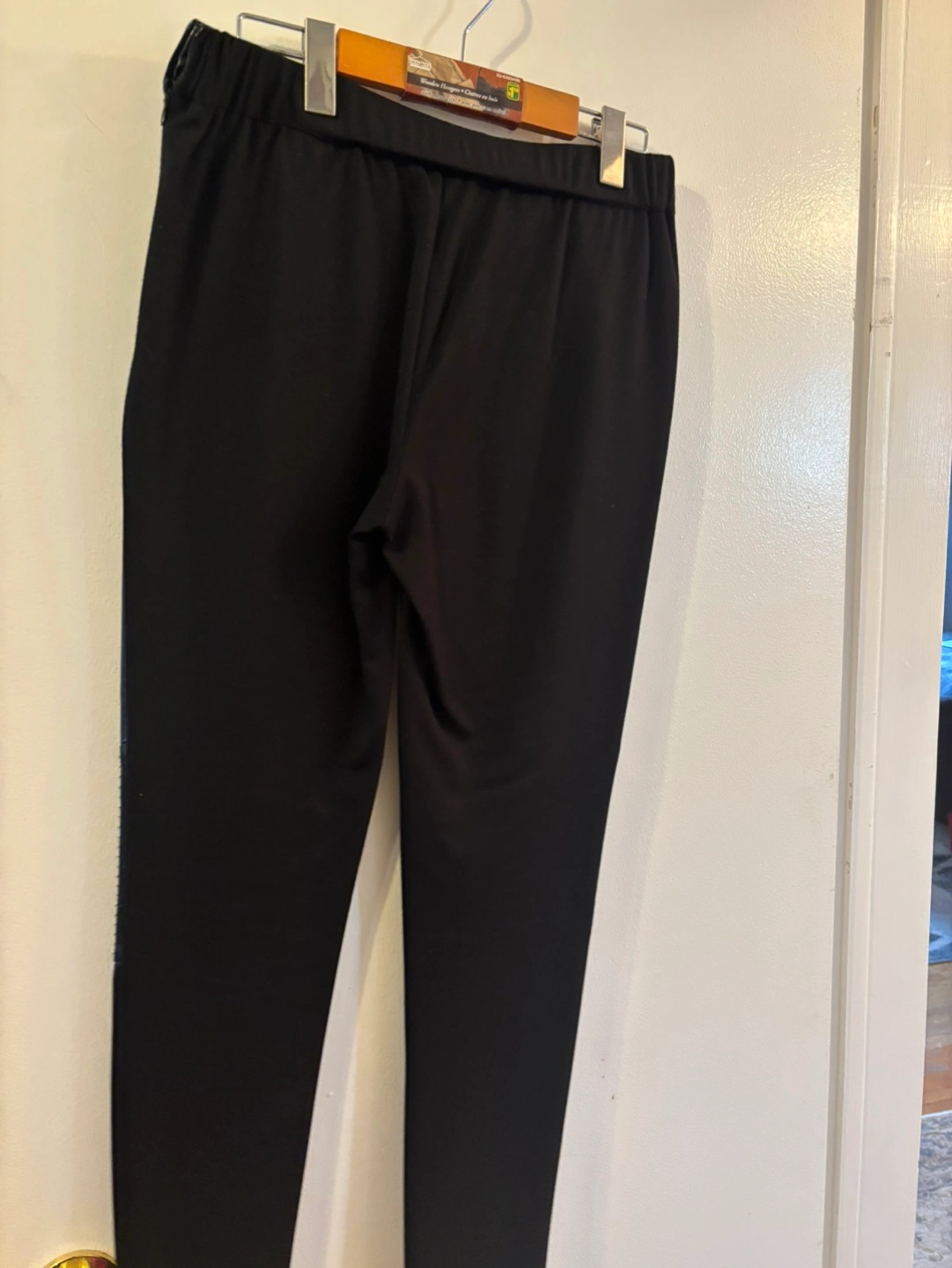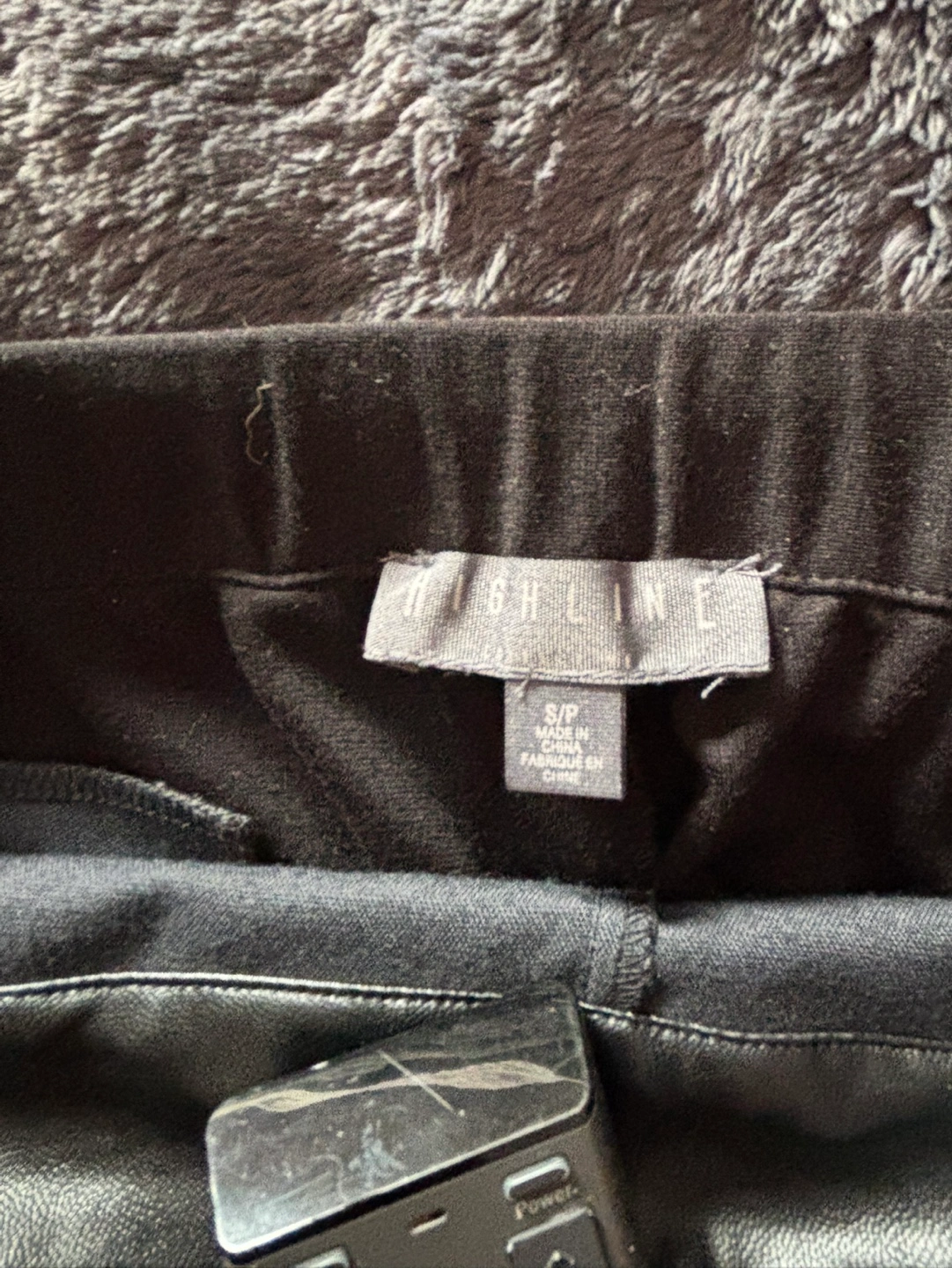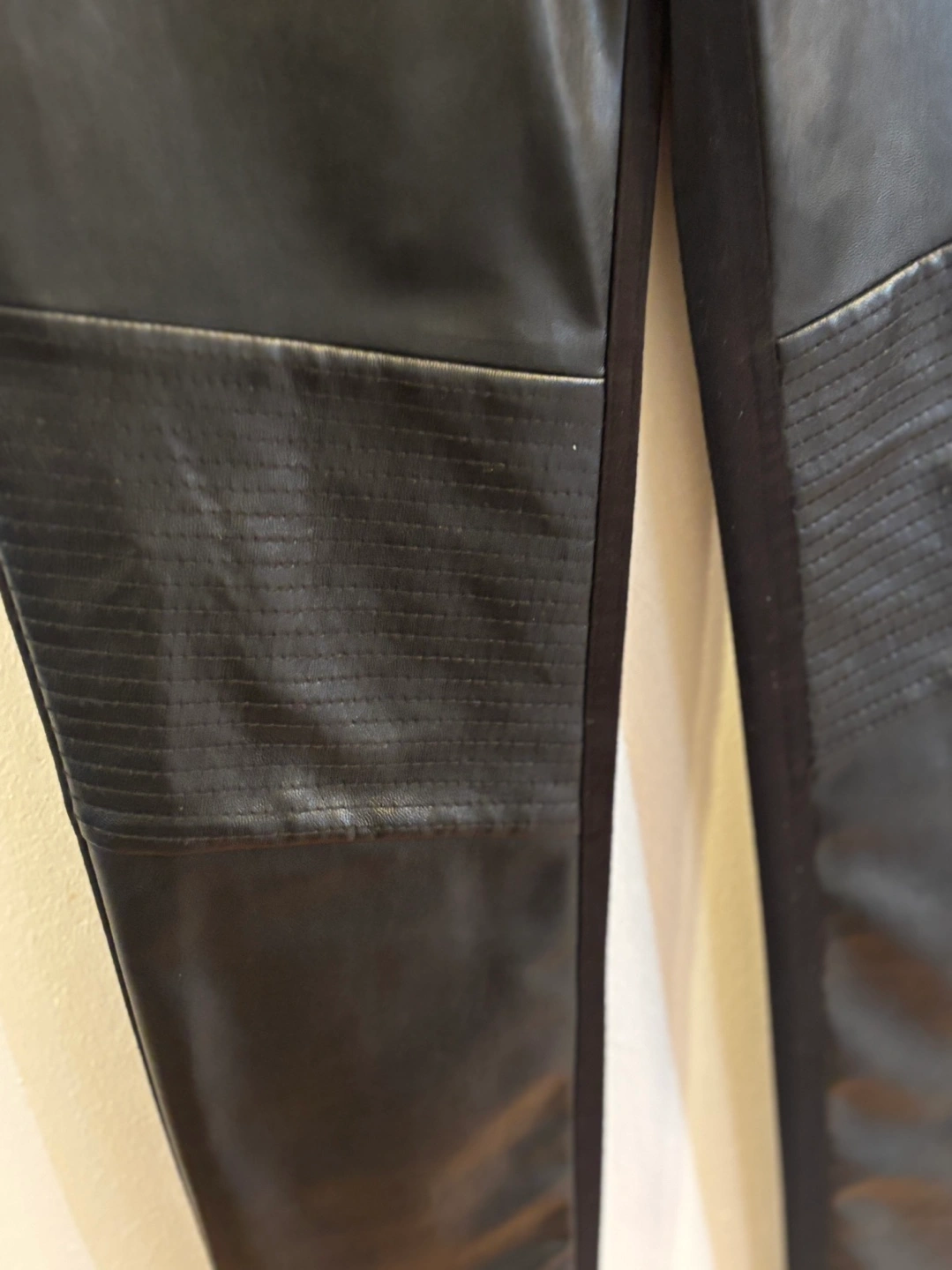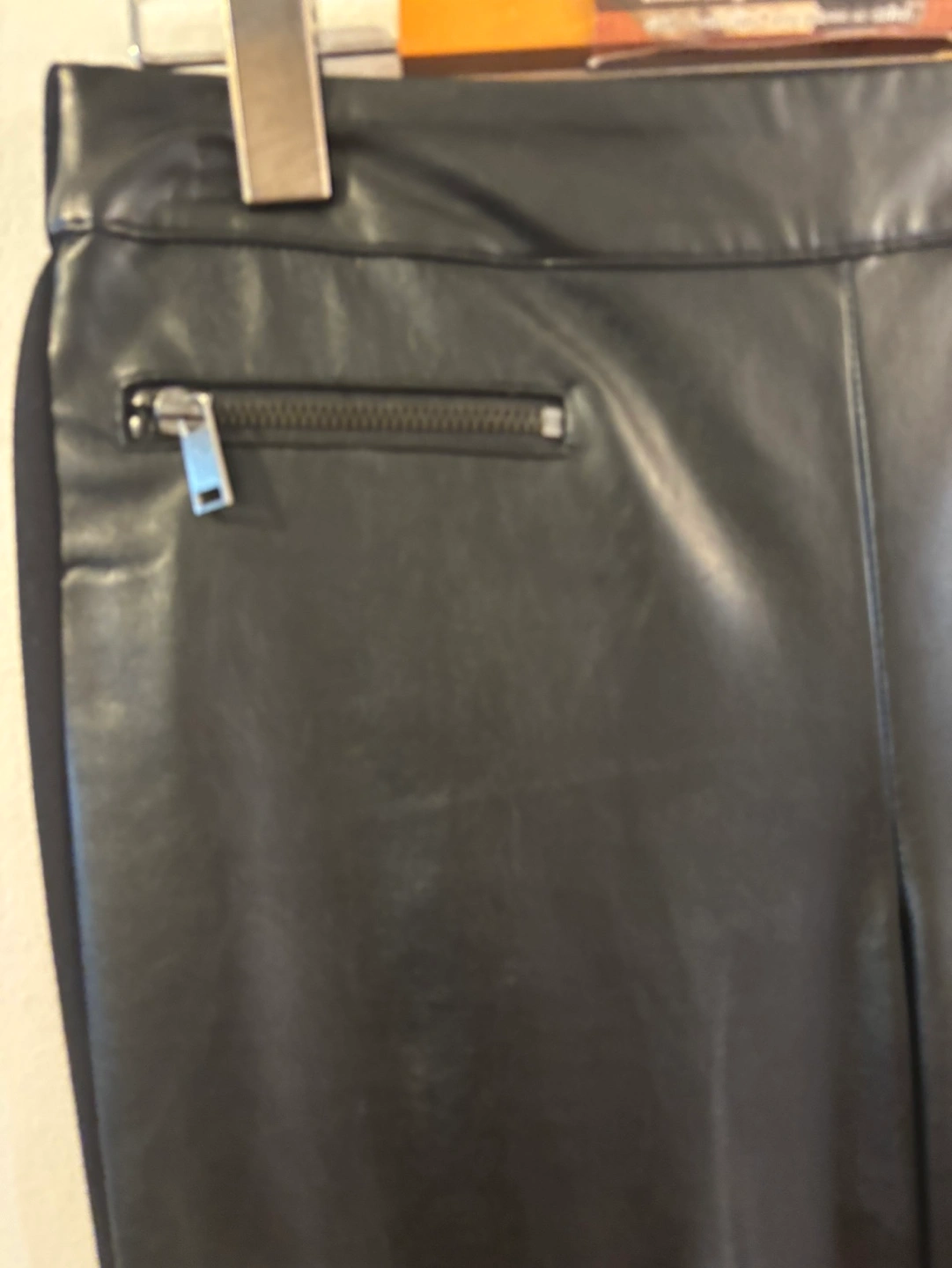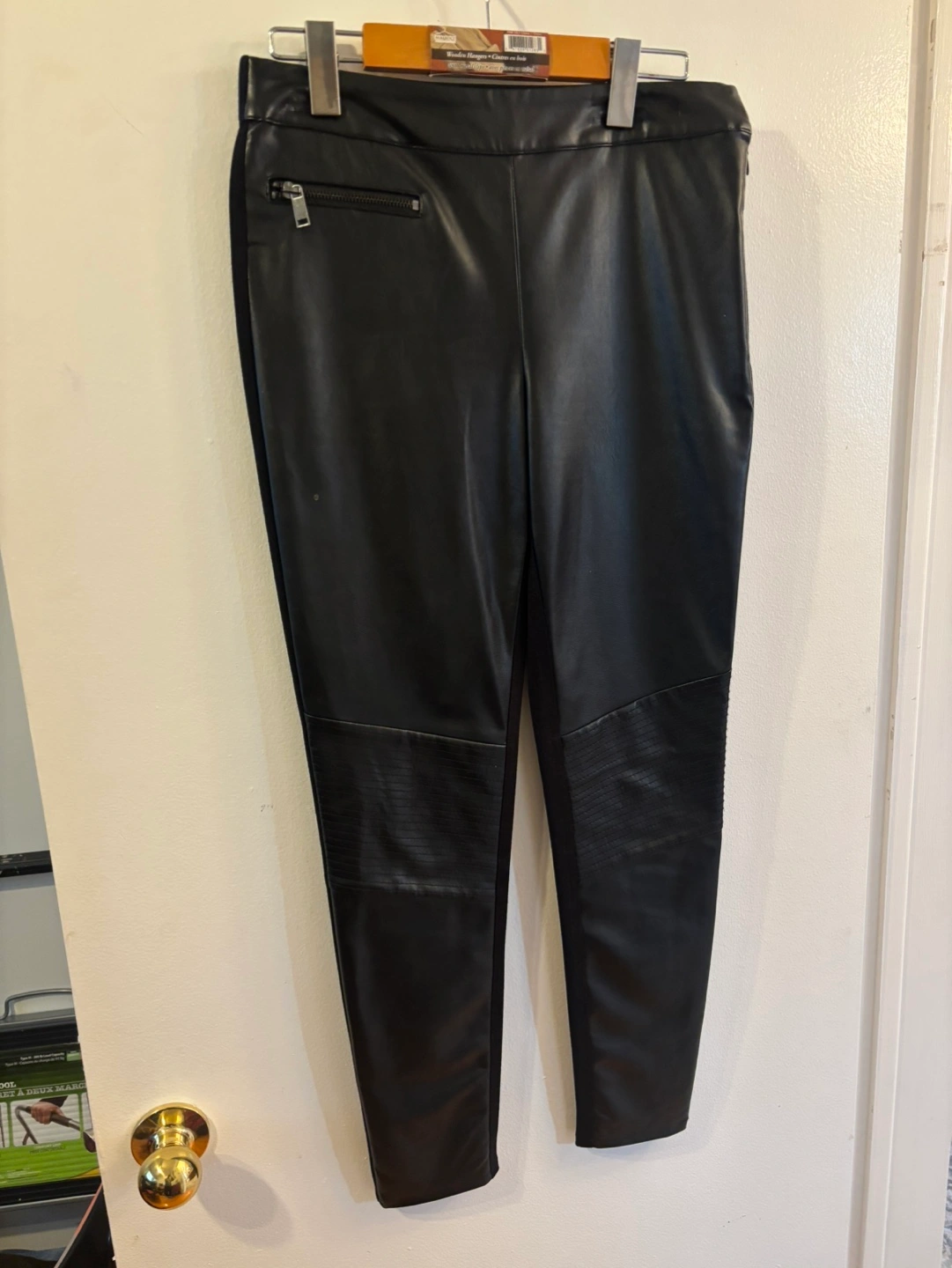 Black faux leather leggings. Size small. Features a pull-on waistband and zippered pockets. Knee detailing. Brand new from the Bay … at Sherway leather in front of pant and ponta material in back lots of stretch …