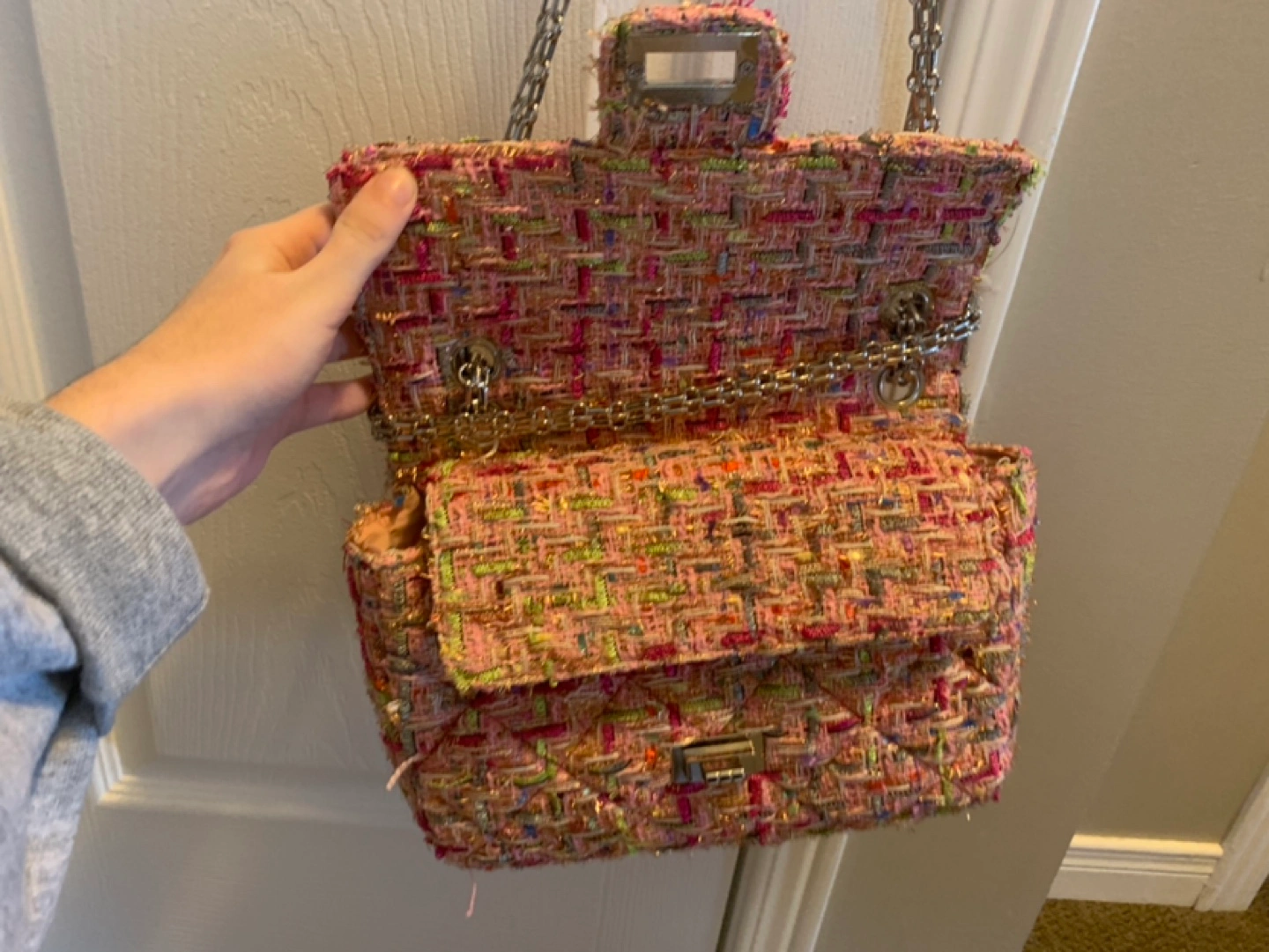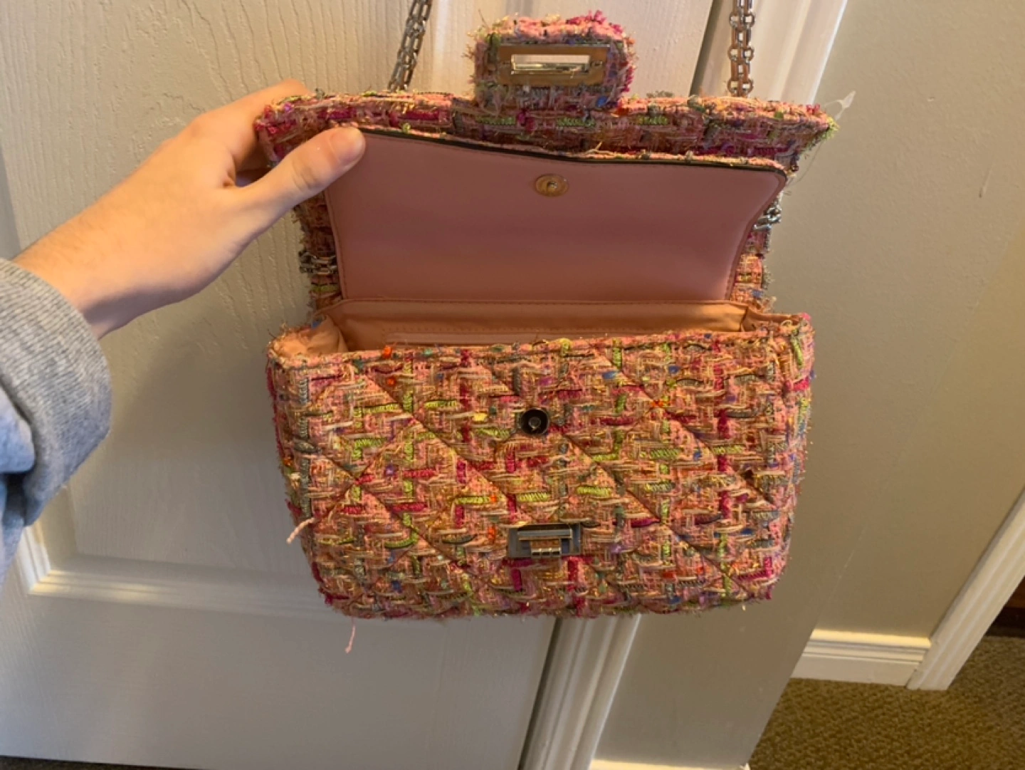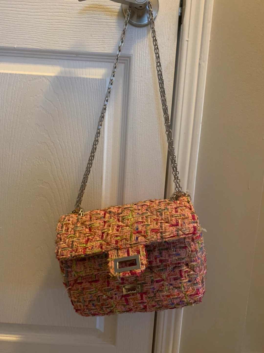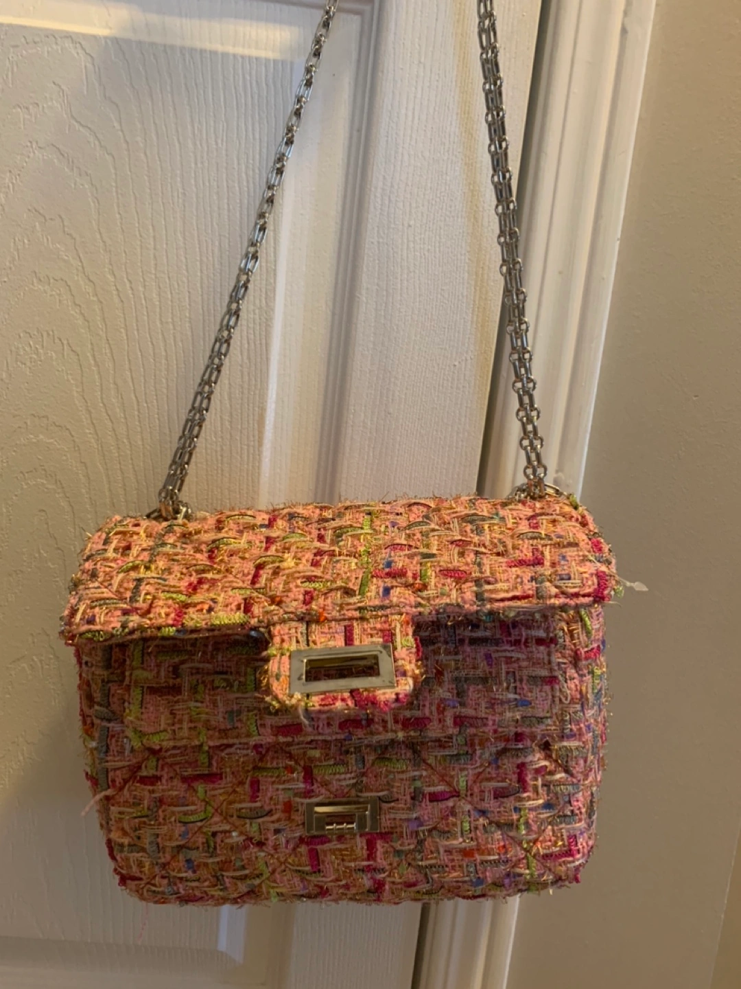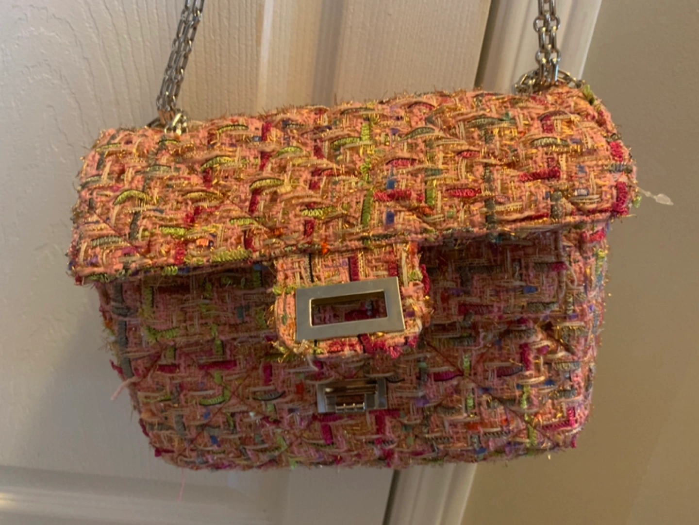 Adorable quilted crossbody bag. Features a silver chain strap and flap closure. Pink tweed exterior, pink interior lining. Small size, perfect for evenings out. porch pickup near erin mills town center