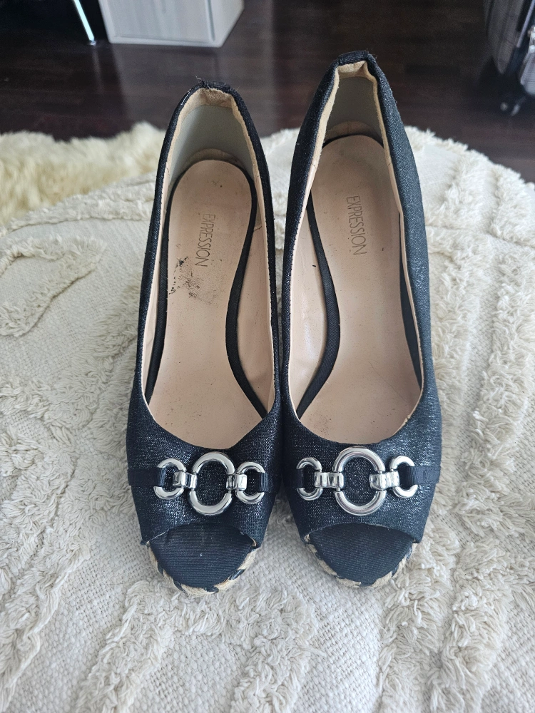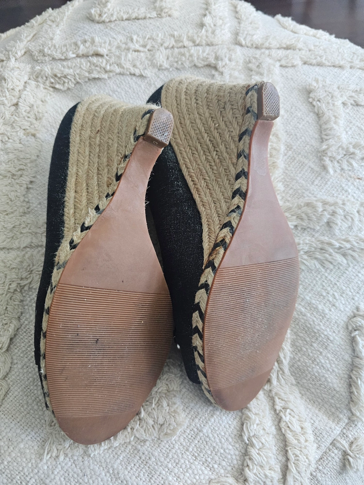 Black peep-toe wedges. Espadrille wedge heel. Silver-toned chain detail. Size 7.5. Worn but in good condition. I thought they were a size 7 but AI says 7.5 , I can't seem to find the size? I was just going to donate. But if anyone is interested! They are yours!
