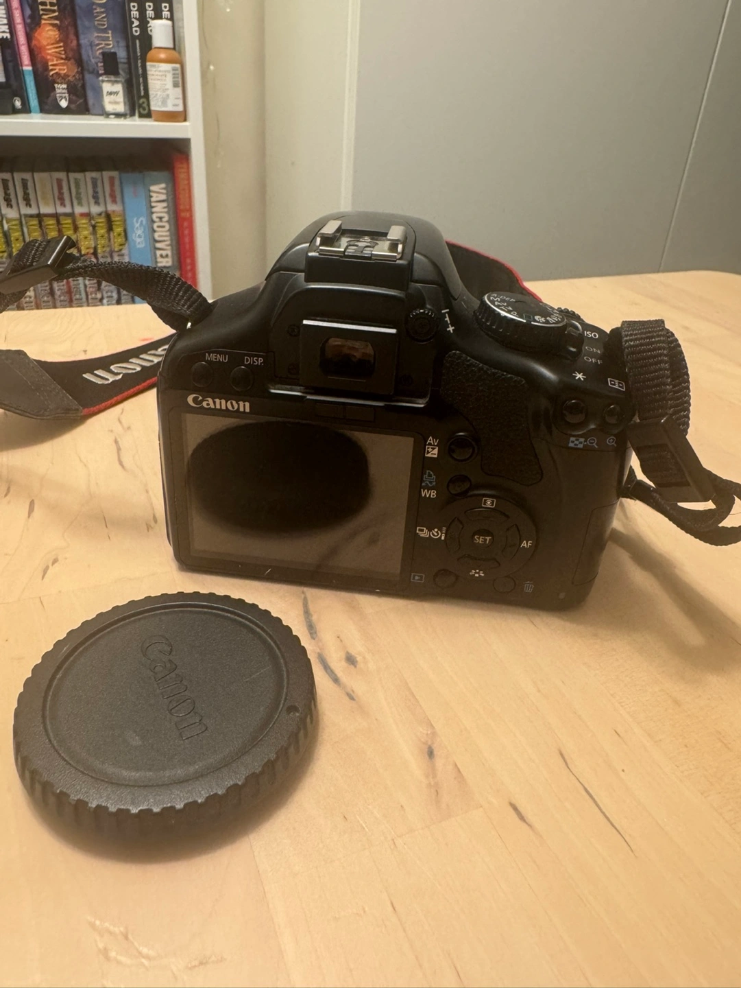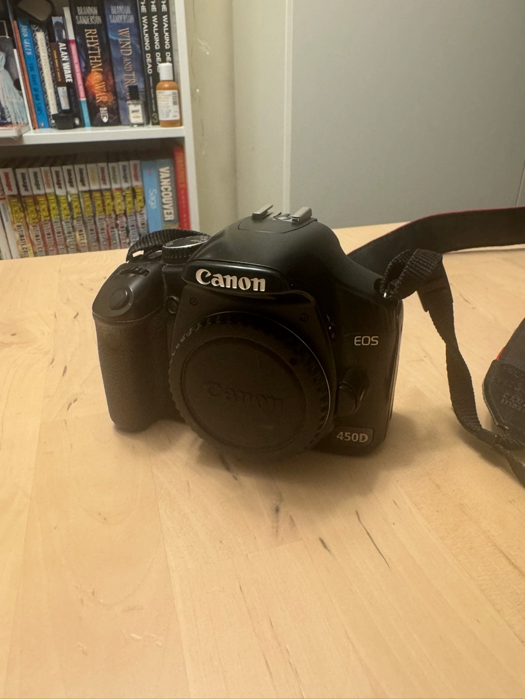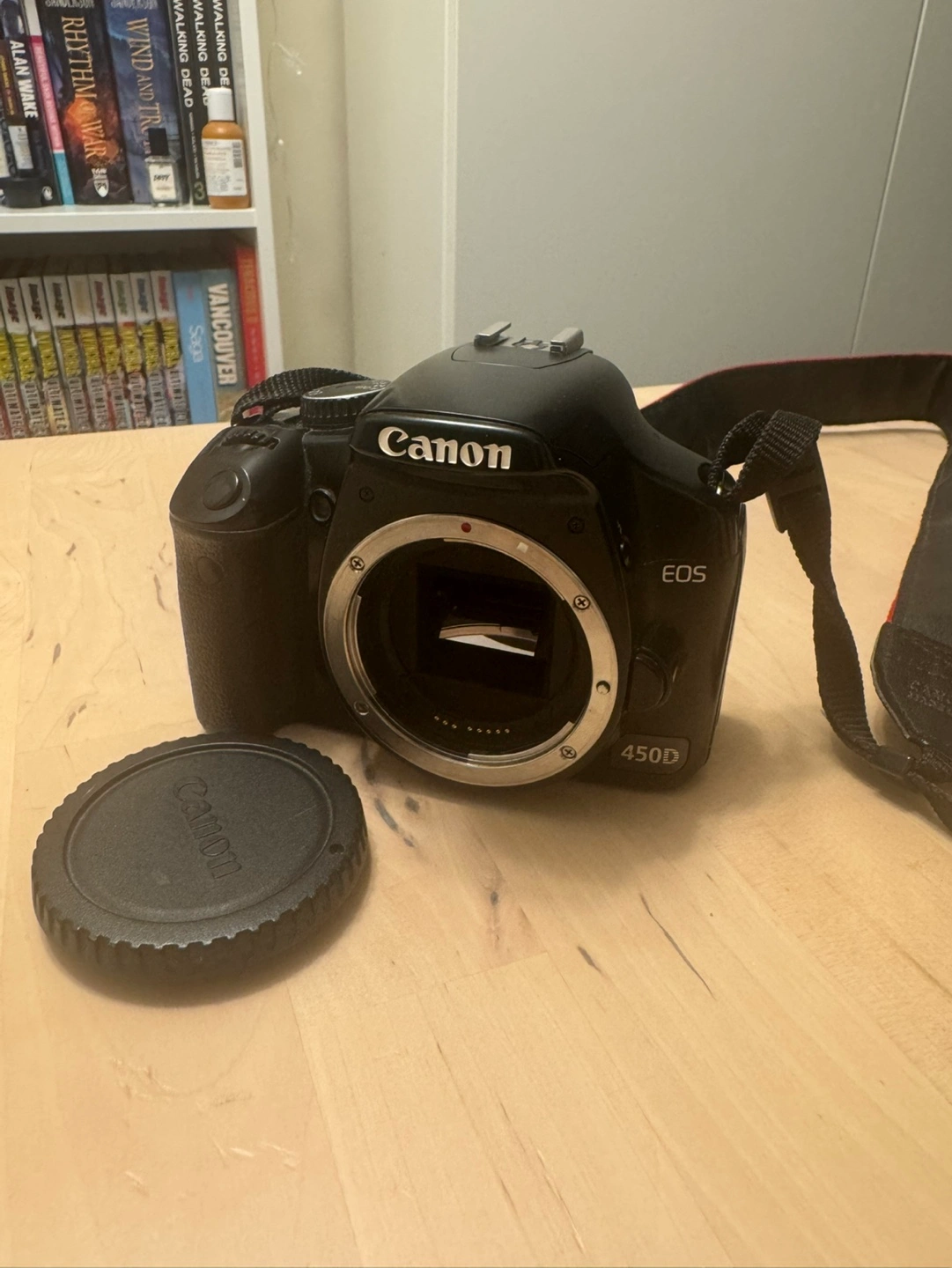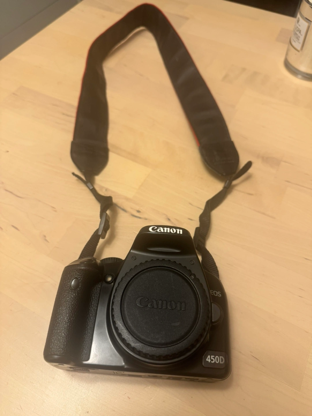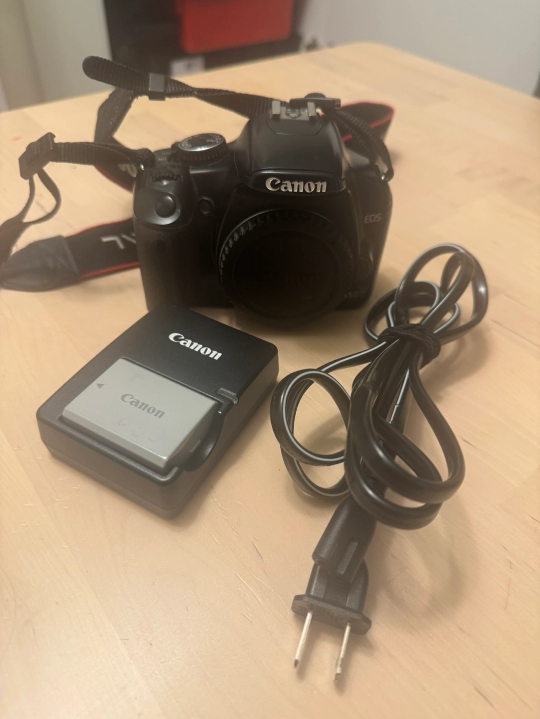 Used Canon EOS 450D DSLR camera. Includes charger, power cord, and camera strap. Black body. Great for beginners.