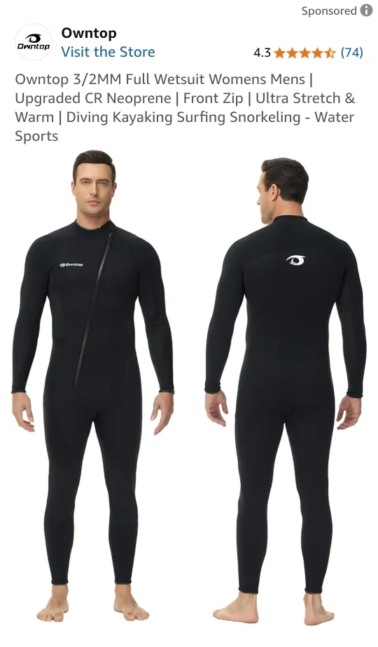 Men's full wetsuit. 3/2MM neoprene. Front zip. Ultra stretch & warm. Ideal for diving, kayaking, surfing, snorkelling. Taking a vacation to the Caribbean to California, it's perfect. amazon link for details https://www.amazon.ca/dp/B0CP3KY5N5