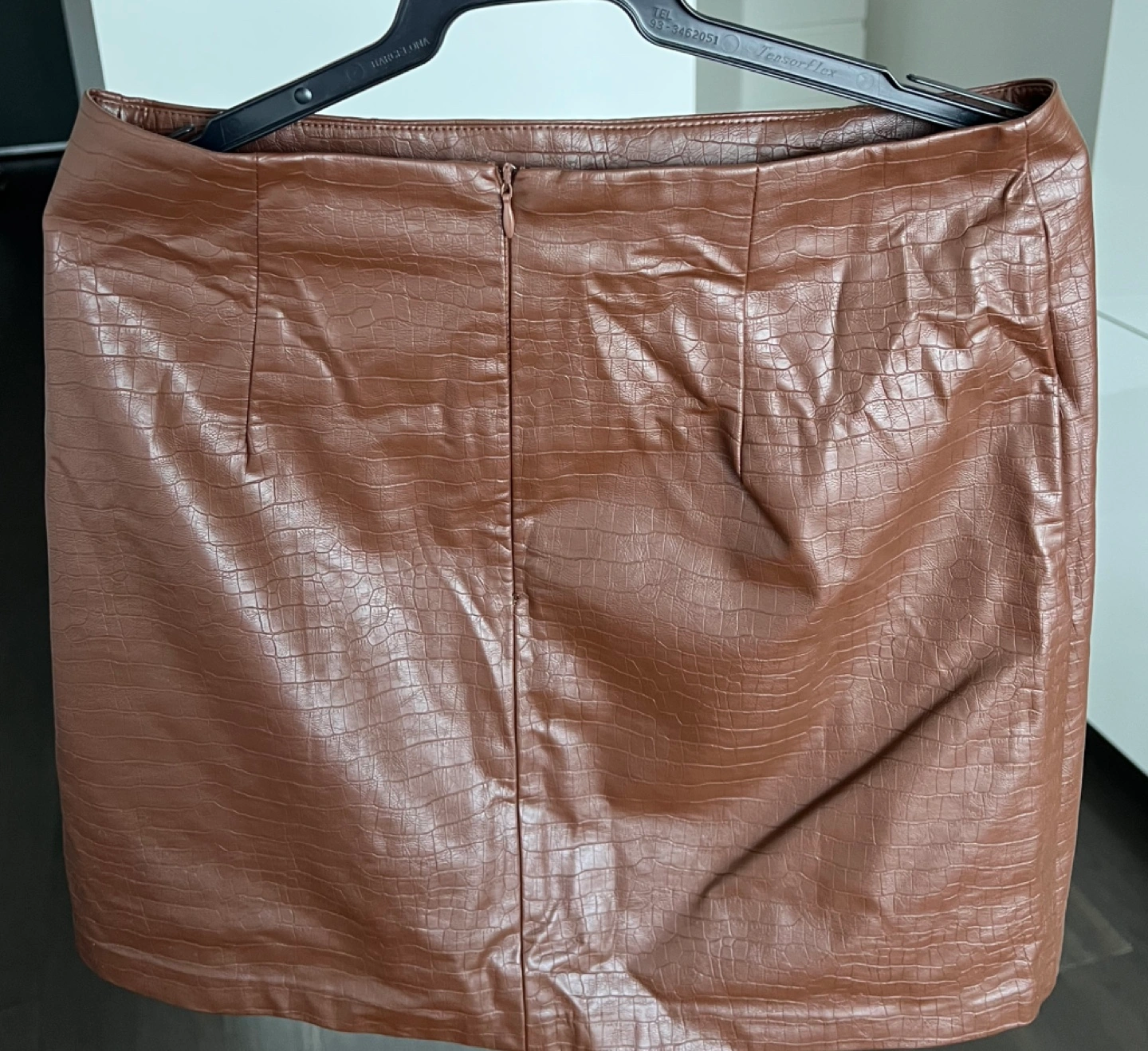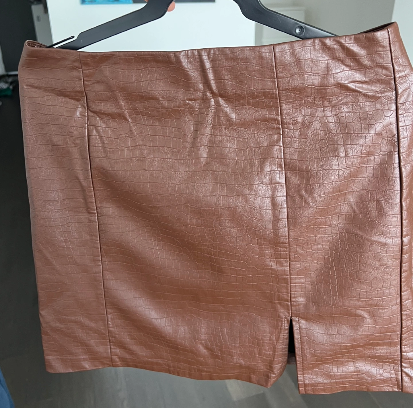 Crocodile-embossed faux leather mini skirt. Brown colour. Features a side slit. Great condition - never worn