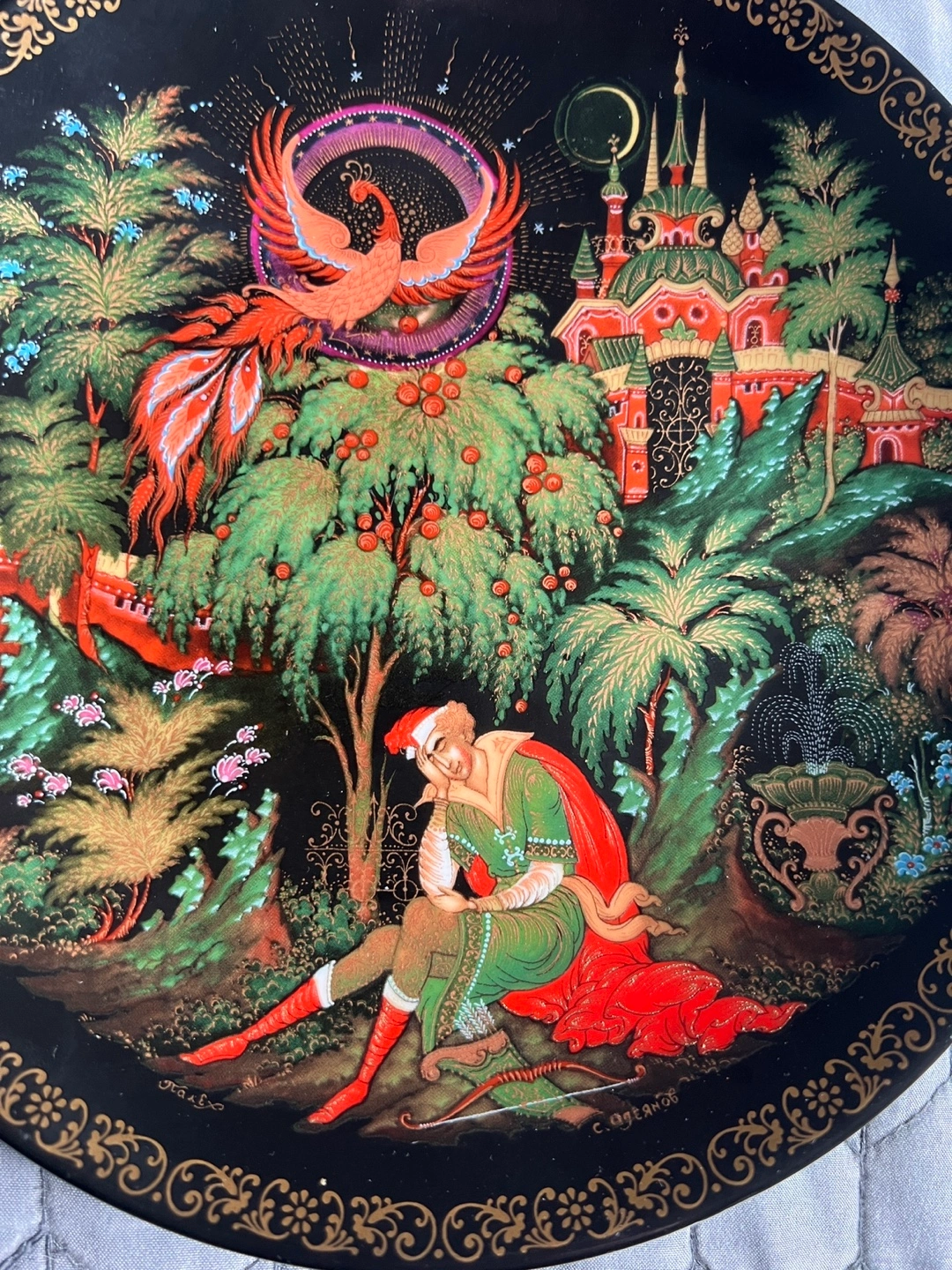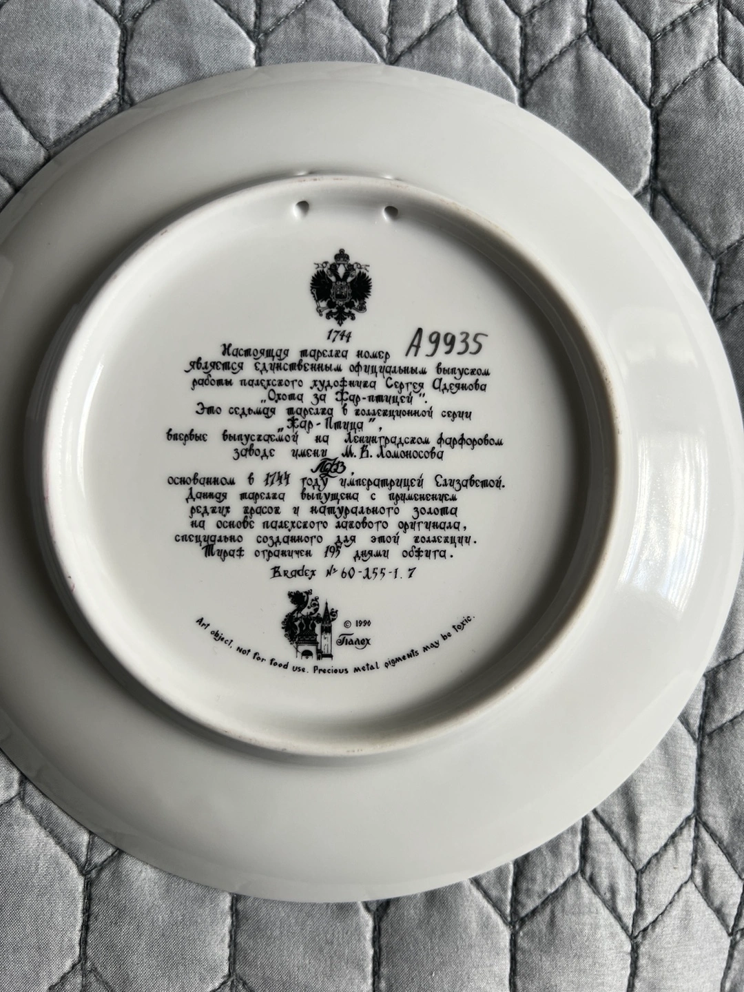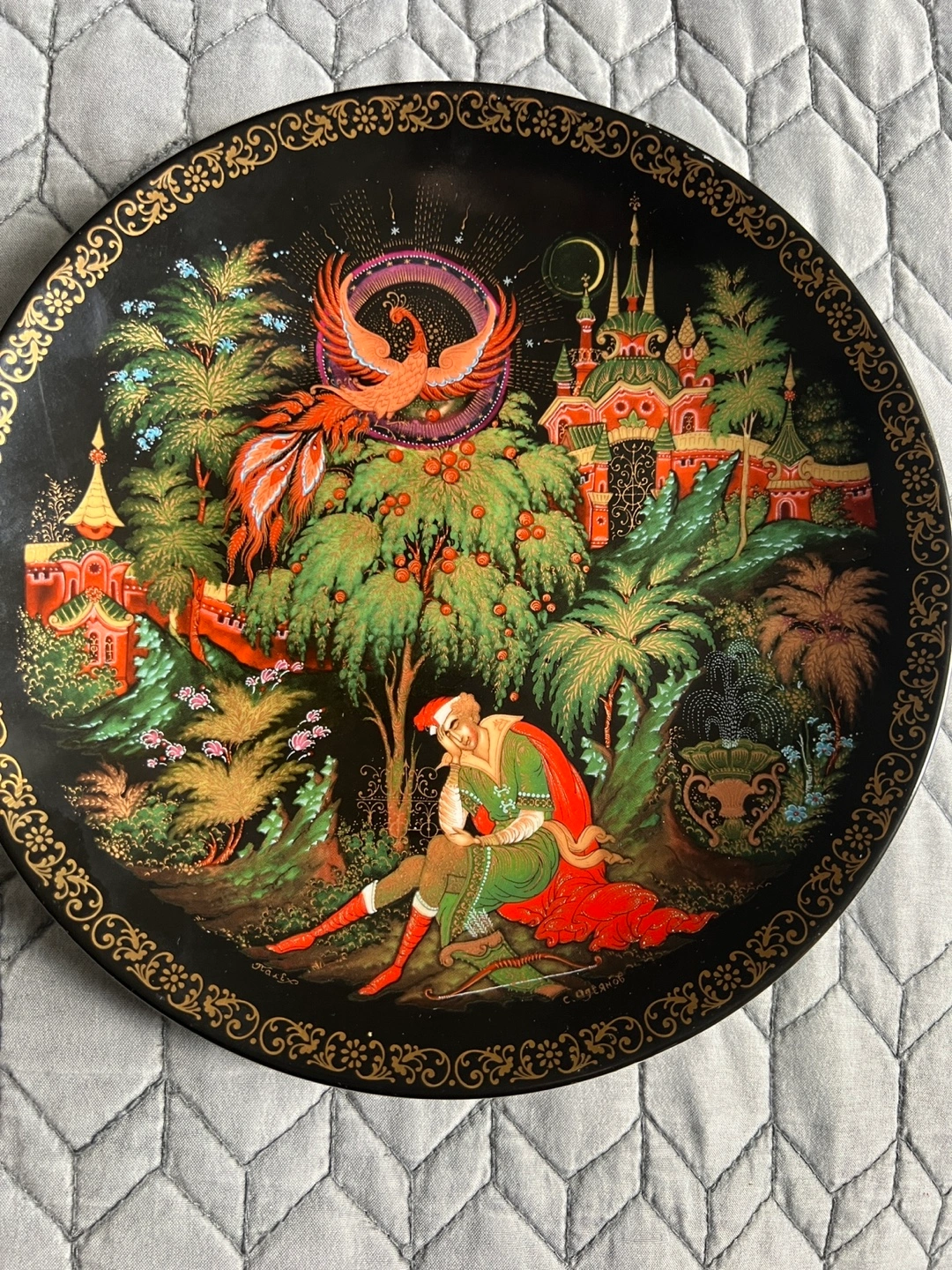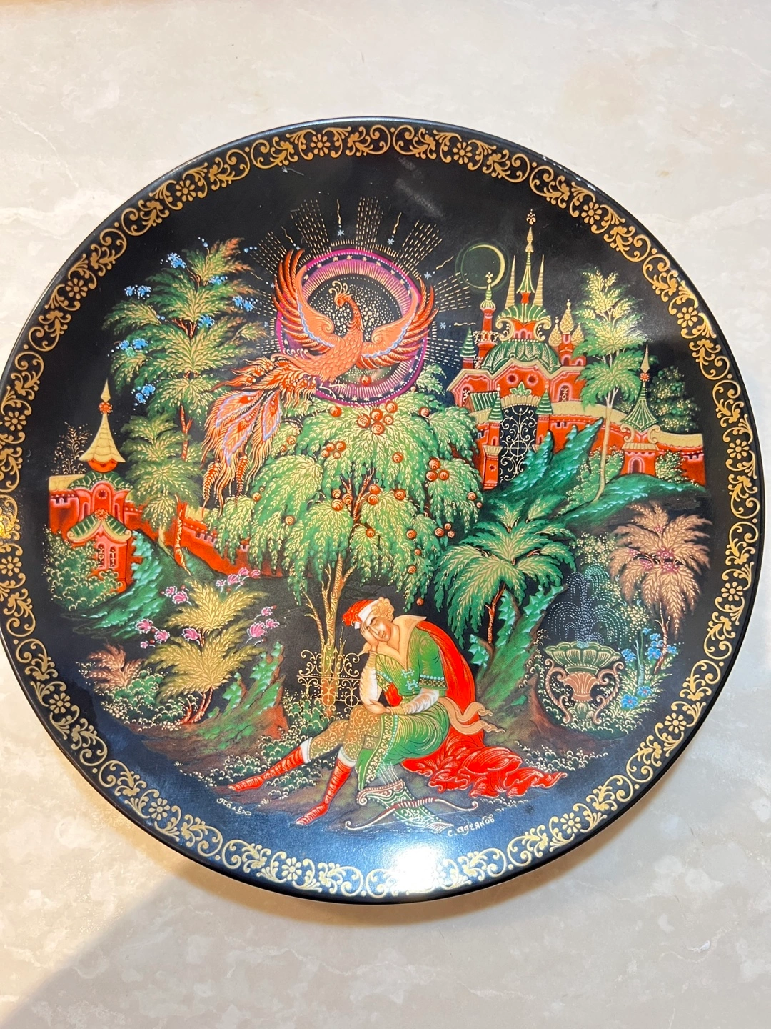 Beautiful collectible plate. Features vibrant colours and intricate detailing. Depicts a fairytale scene. Excellent condition. Numbered A9935. Russian Firebird collectible plate, likely from the "Russian Legends" or "Firebird" series, possibly by the Bradford Exchange or Tianex. These plates are based on the Russian fairy tale "The Firebird." Key details include: Subject: Depicts the scene "Awaiting the Firebird," featuring a man (likely Prince Ivan) and the Firebird. Origin: Made in the Russian Federation, likely in the early 1990s. Material: Likely porcelain or ceramic. Collectibility: Part of limited edition series, popular among collectors. Design: Features vibrant colors, intricate details, and gold accents. Text: Includes the artist's signature or mark, possibly "C.MBLANCE”
