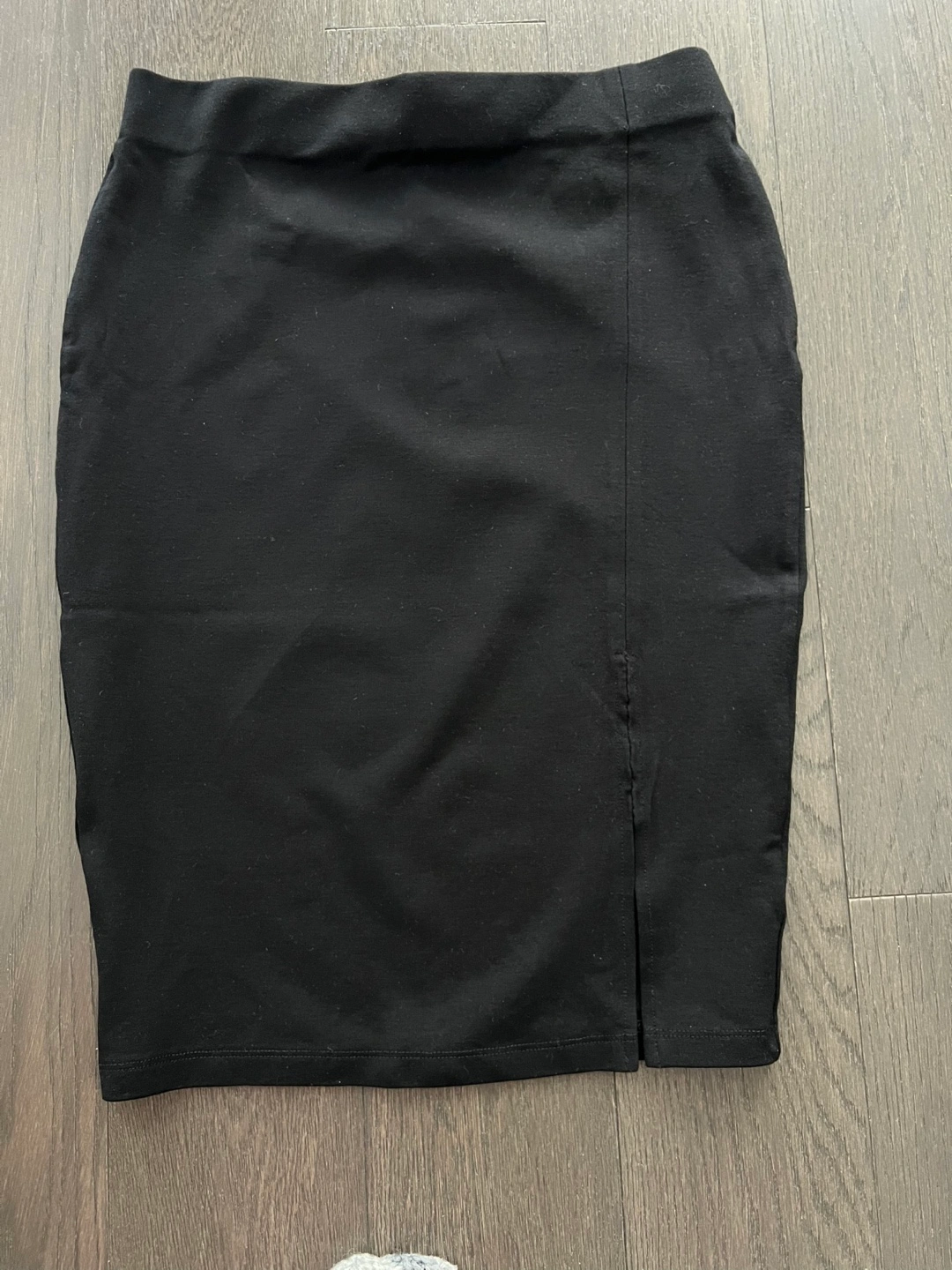 Form-fitting midi pencil skirt. Features a side slit. Stretchy fabric