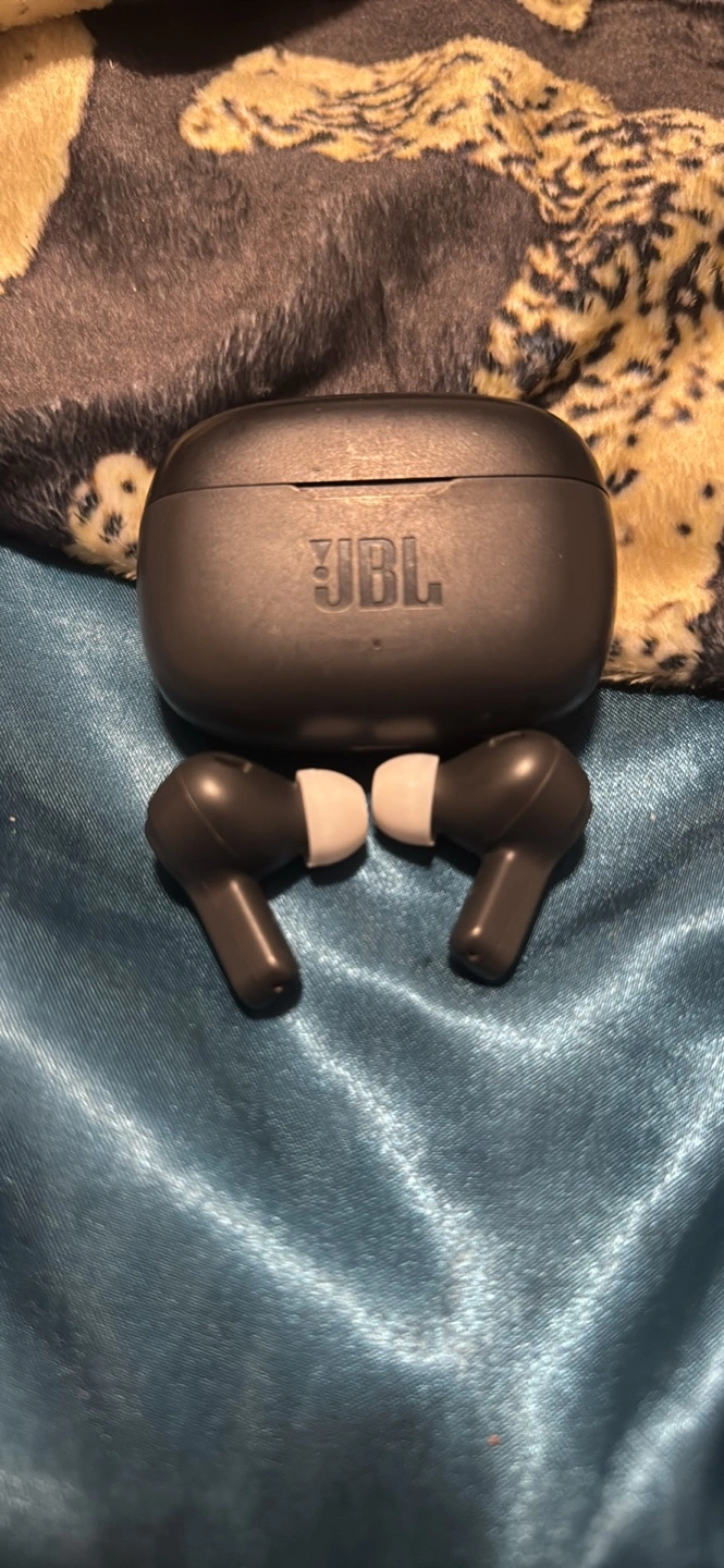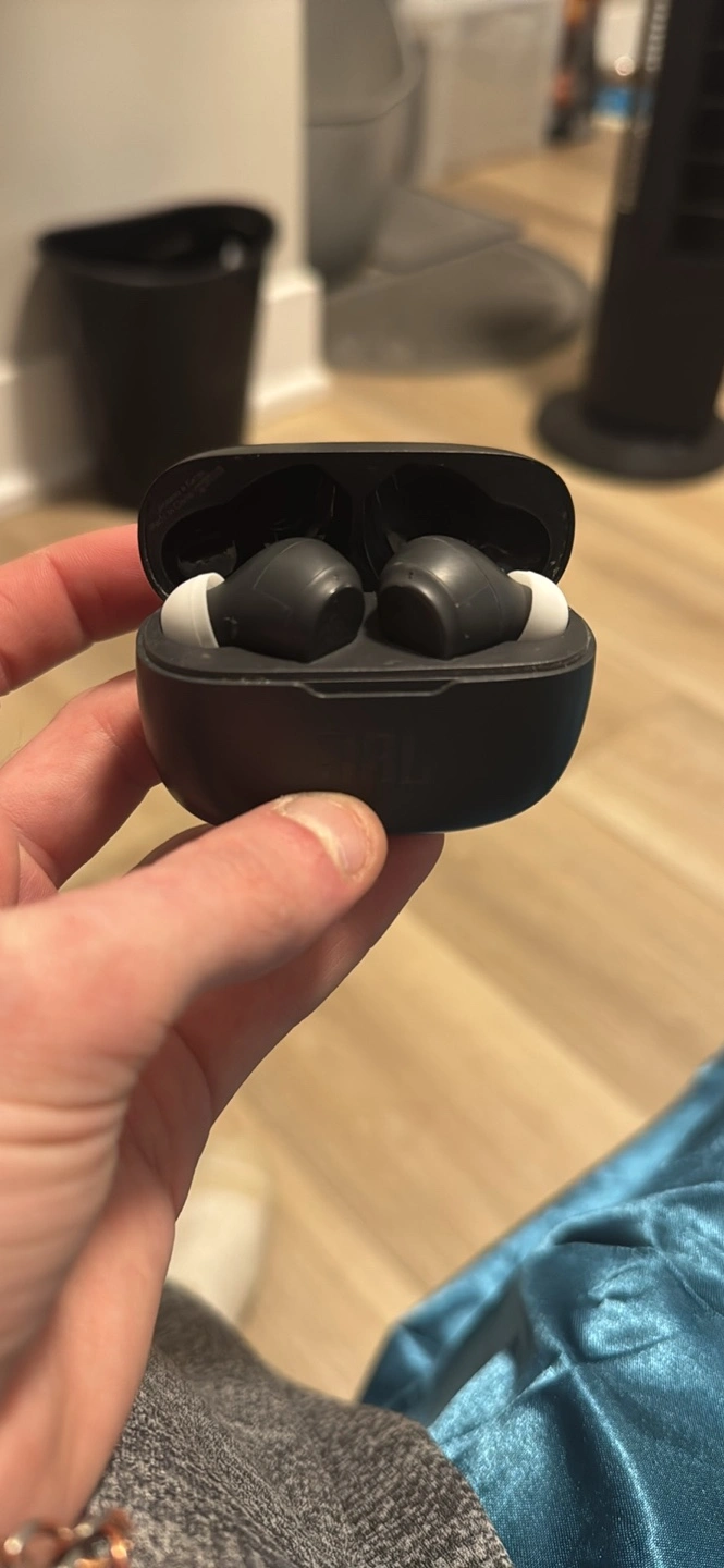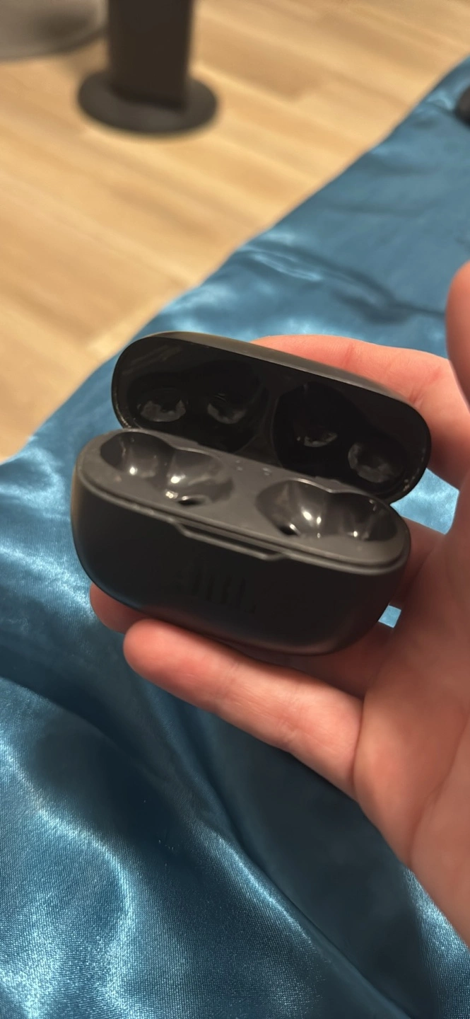 Black true wireless earbuds. Charging case included. Great for listening to music or podcasts.