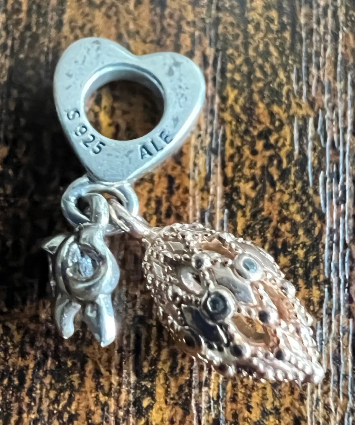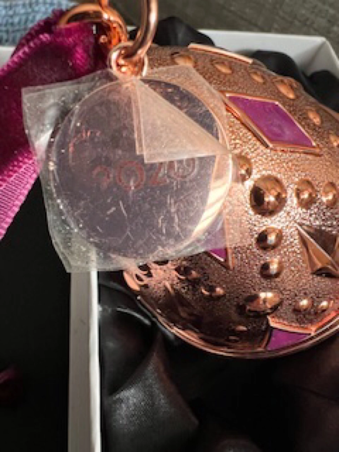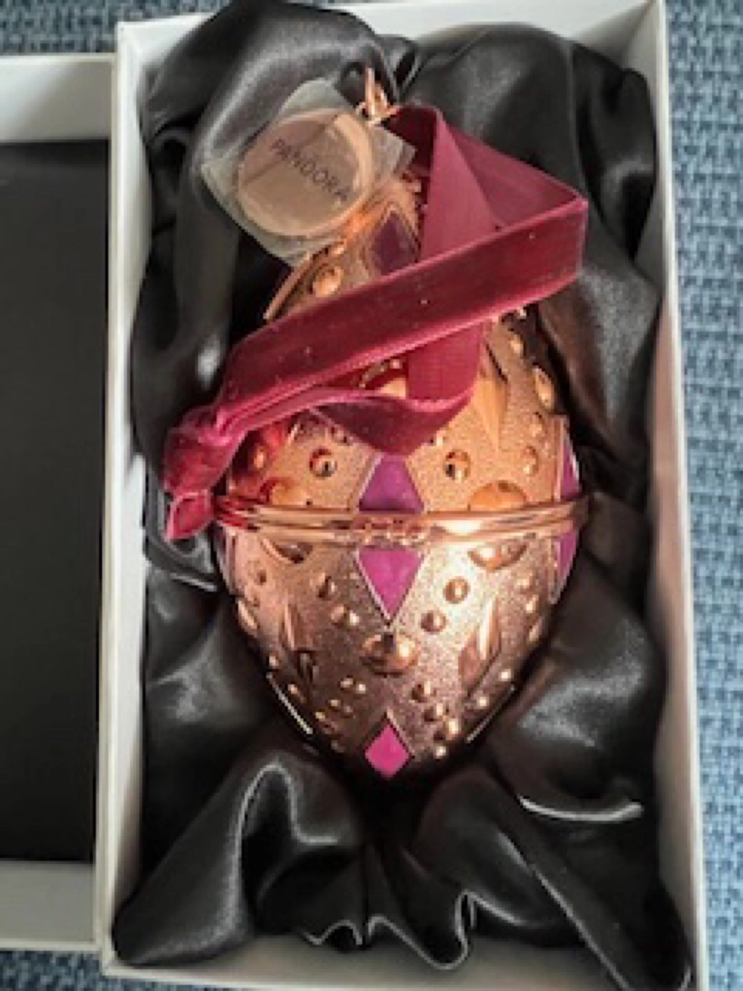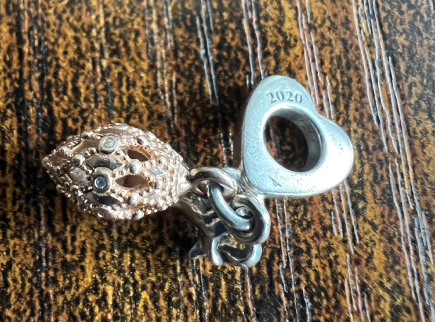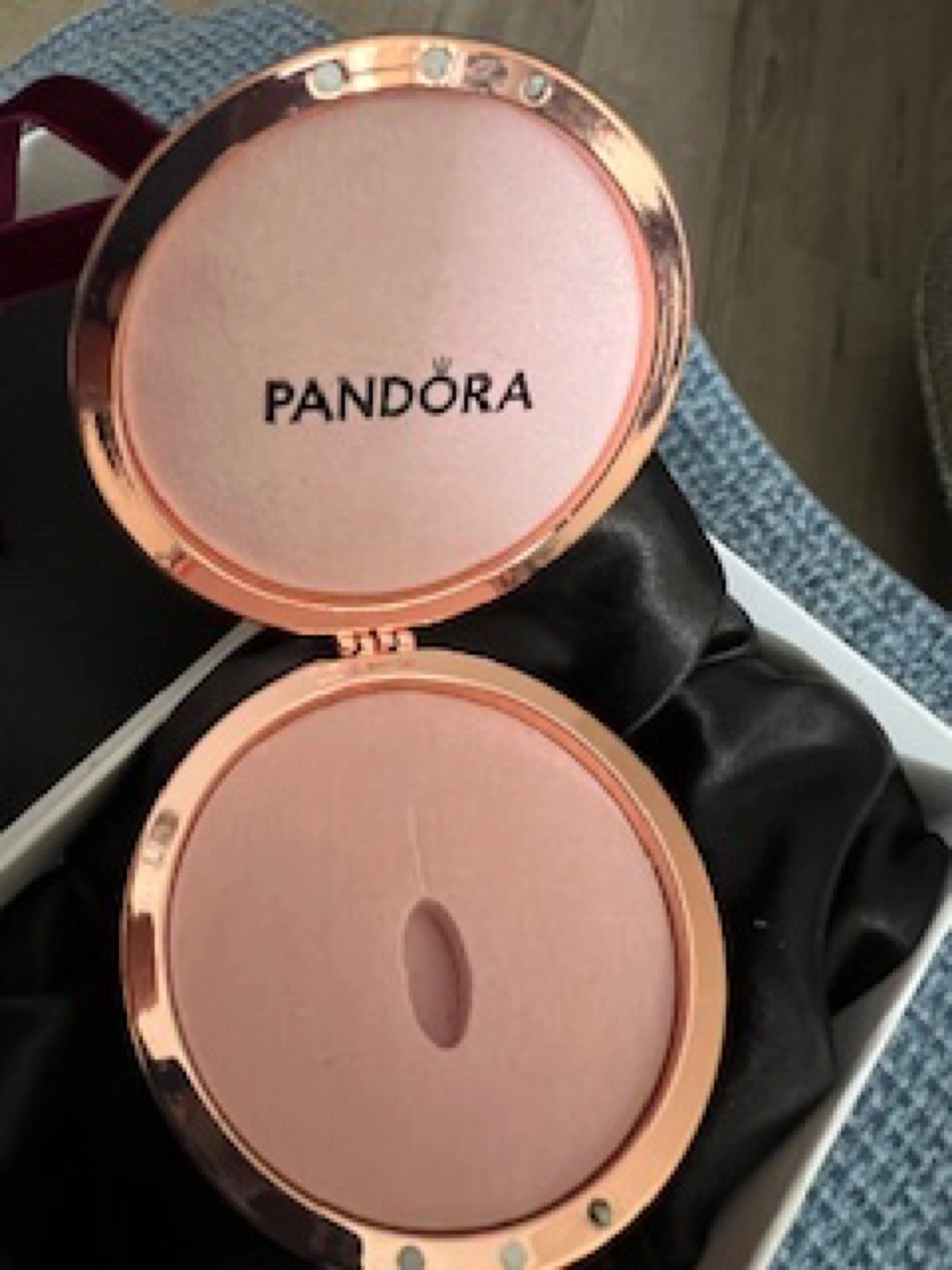 Rose gold charm and similar coloured metal ornament. Hinged jewellery box. Comes in original Pandora box. Dated 2020. OBO