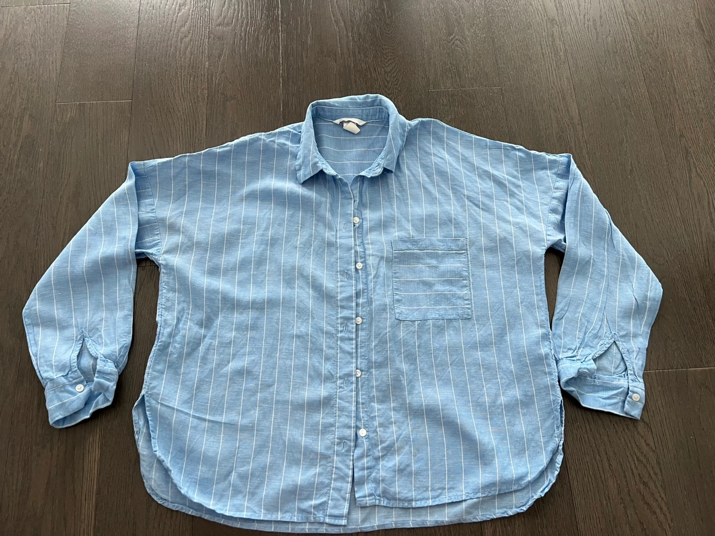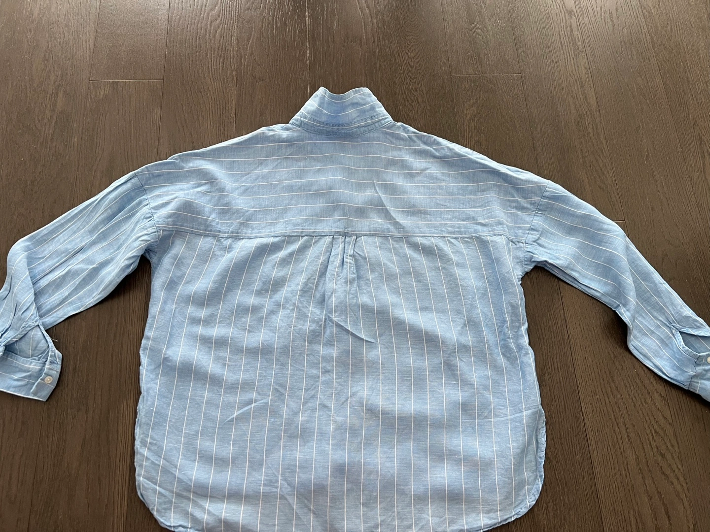Light blue oversized button-down shirt. White vertical stripes. Long sleeves, one chest pocket. Relaxed fit.