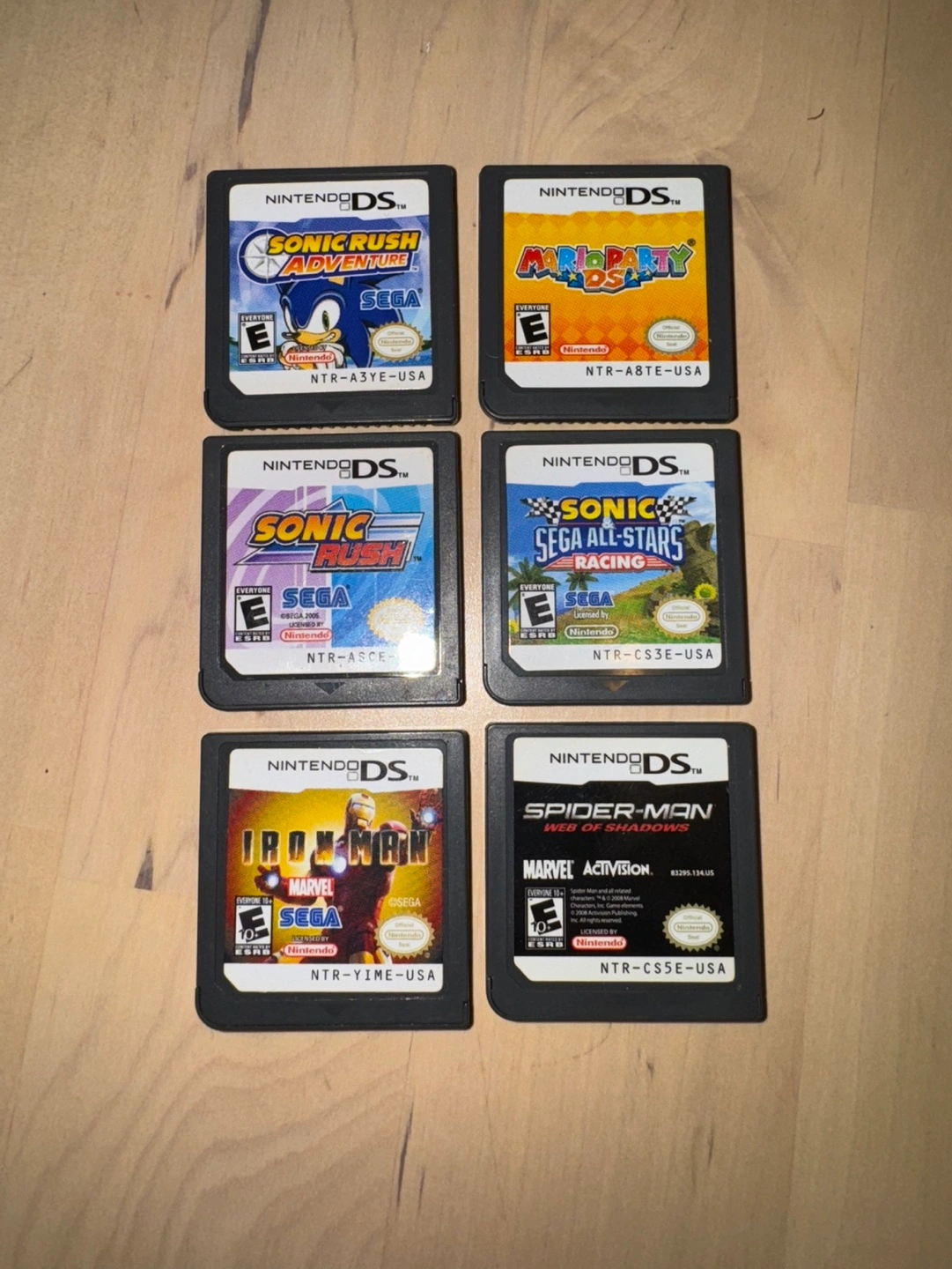 Sonic Rush Adventure - $40 Sonic Rush - $25 Mario party DS - (SOLD) Spiderman web of shadows - $20 Iorn man - $10 Sonic all stars racing - $10 Lot of six Nintendo DS games. Includes Sonic Rush, Mario Party DS, Sonic Rush Adventure, Sonic Sega All-Stars Racing, Iron Man, and Spider-Man Web of Shadows. Pre-owned.