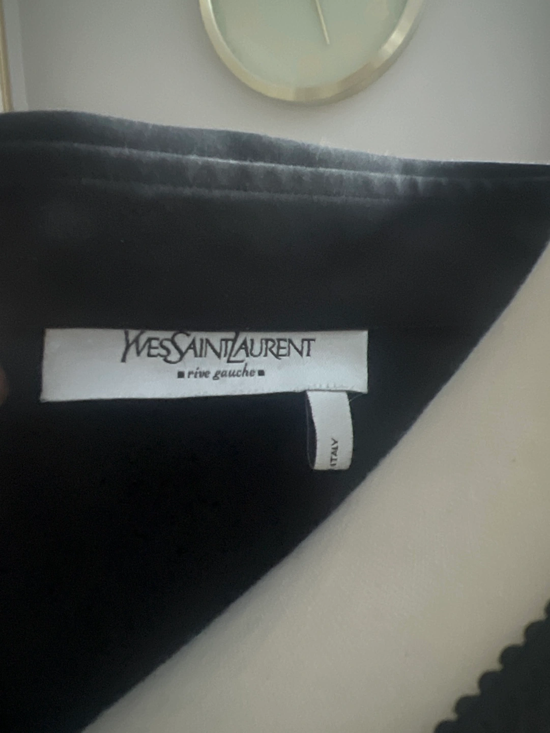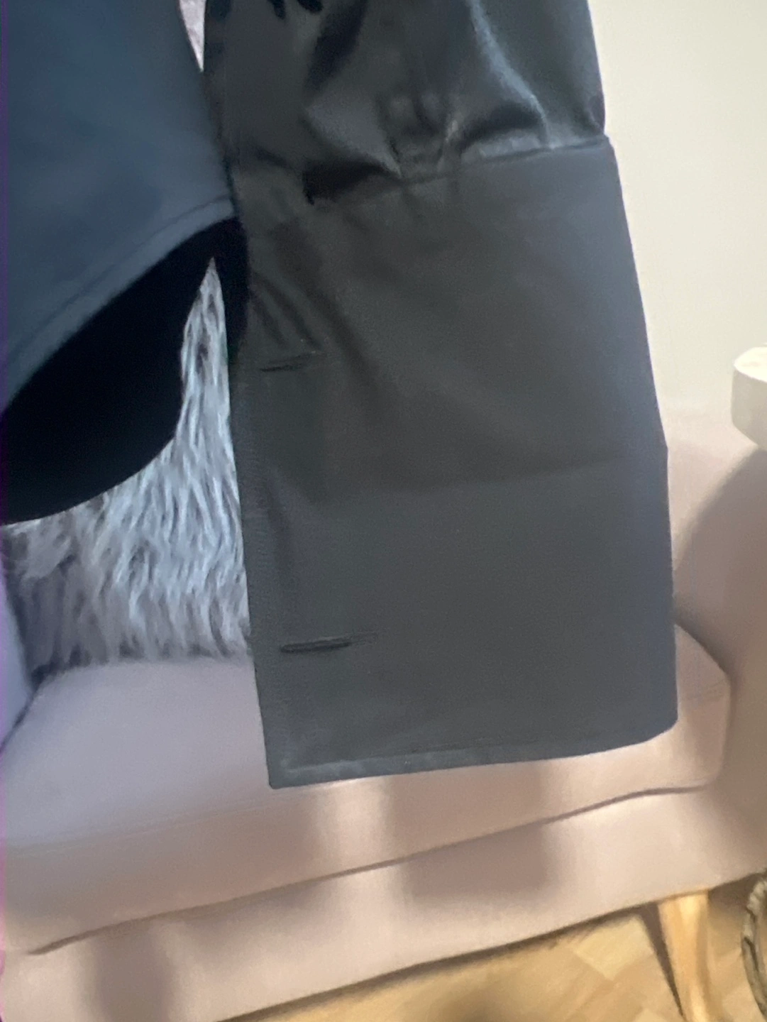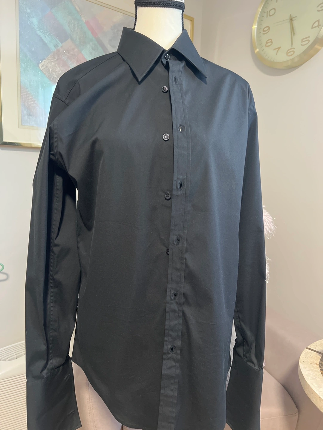 Long-sleeve button-down tuxedo shirt. Black colour. Size 39 15 1/2. French cuffs. Made in Italy. New without tag. Ordered wrong size.