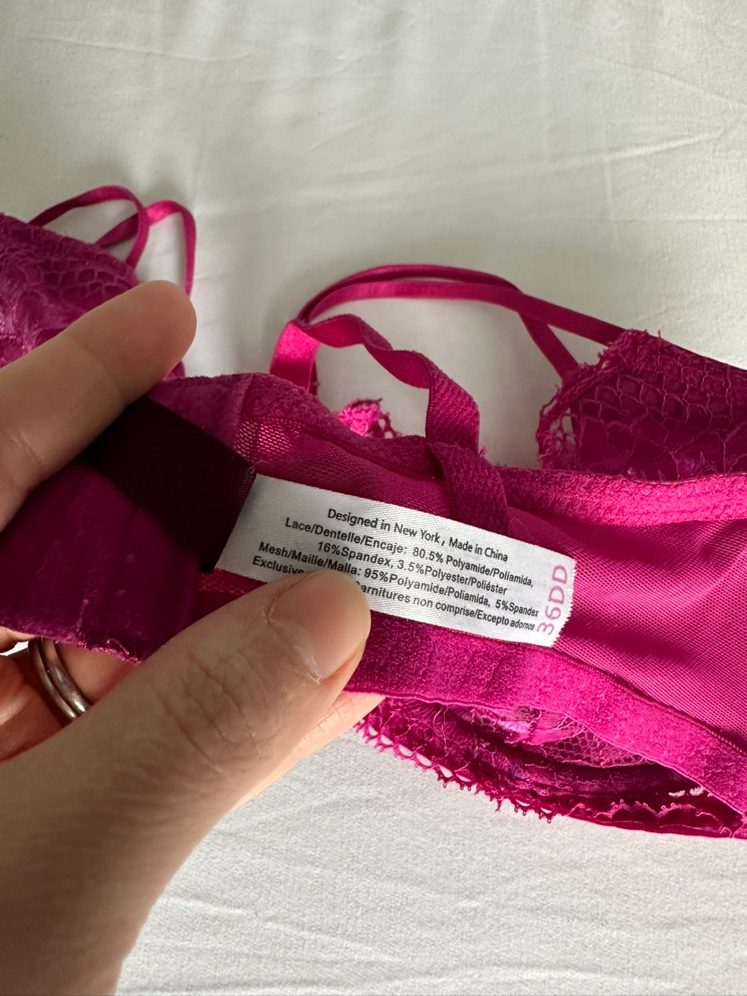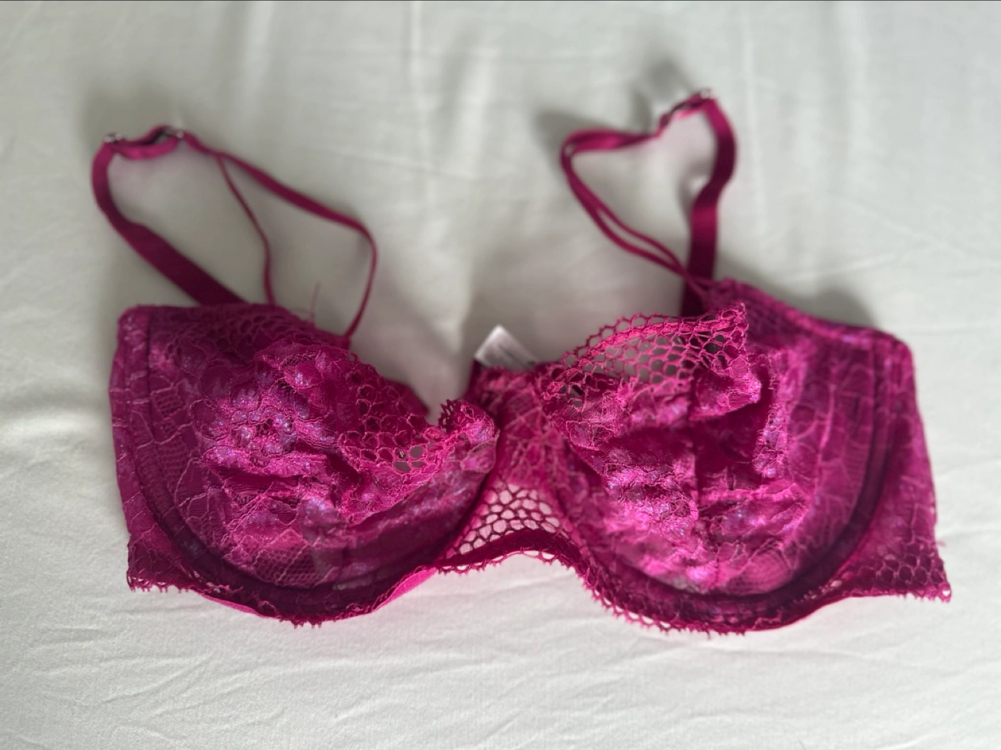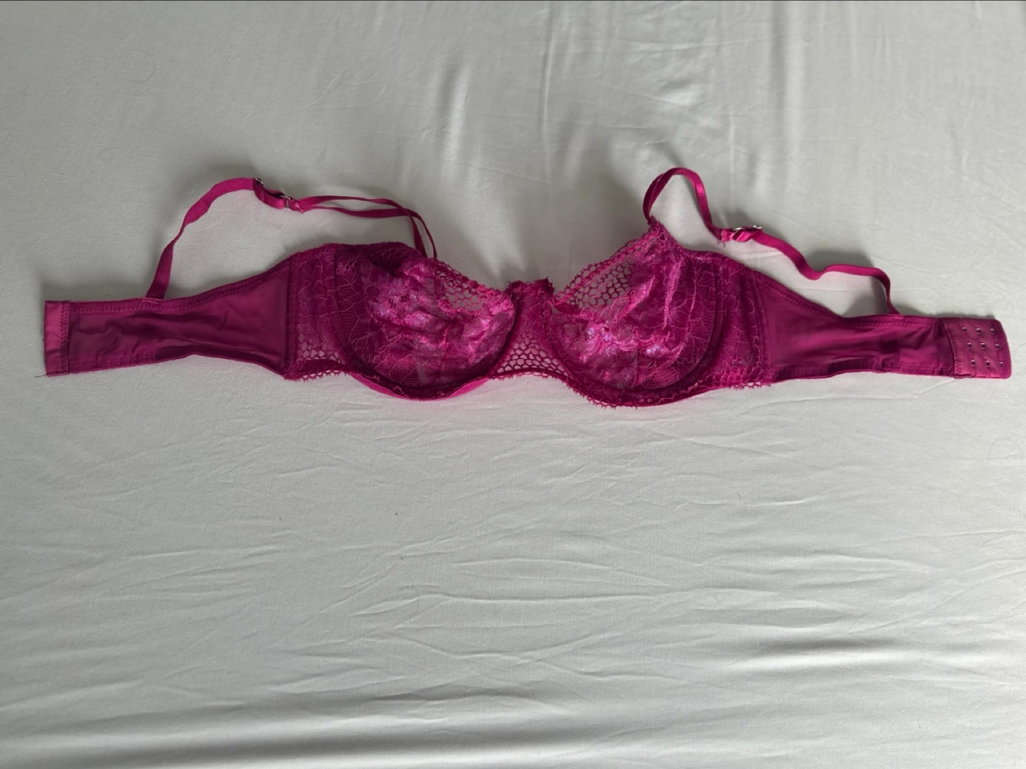 Gorgeous magenta lace bra. Features delicate detailing and adjustable straps. Hand wash recommended.