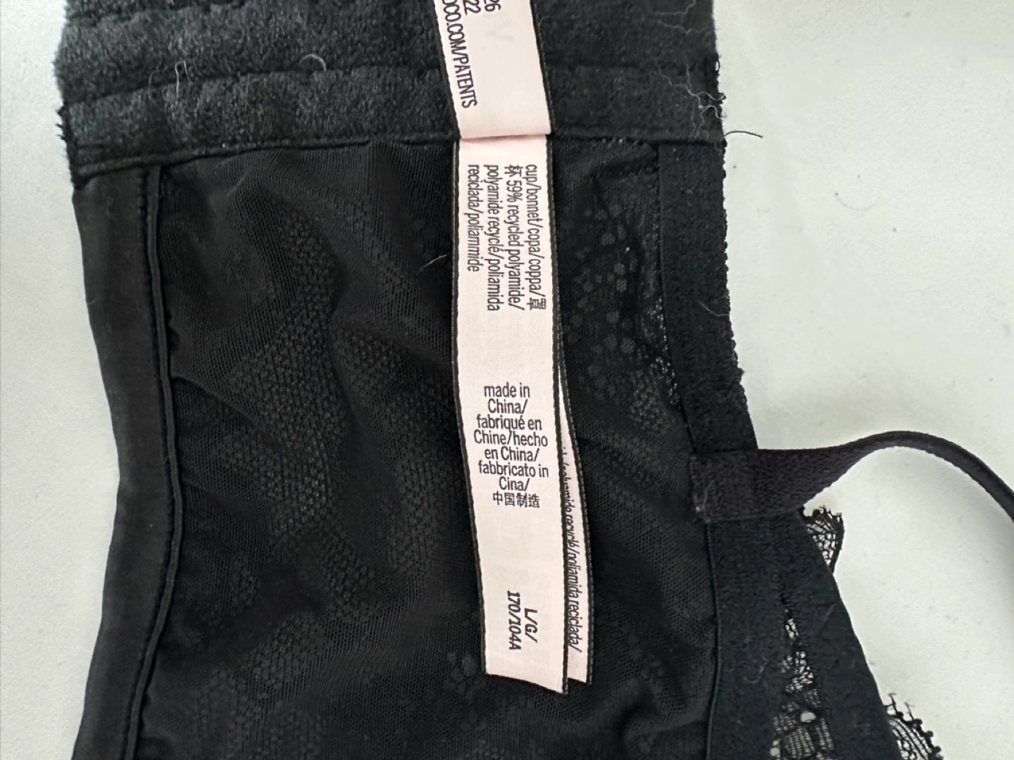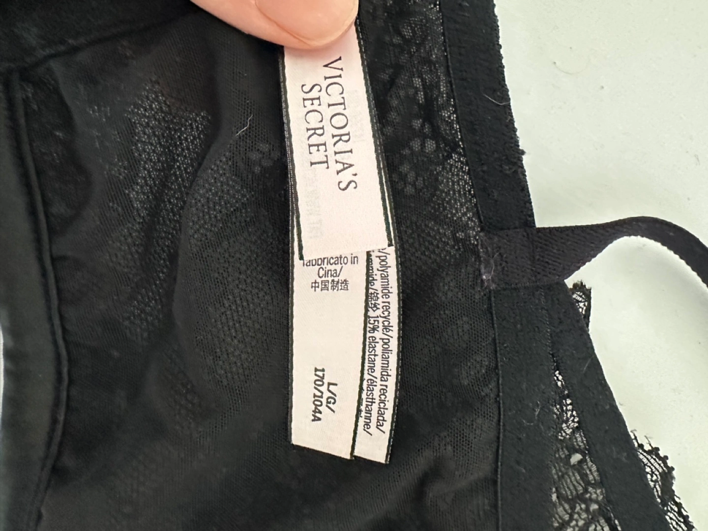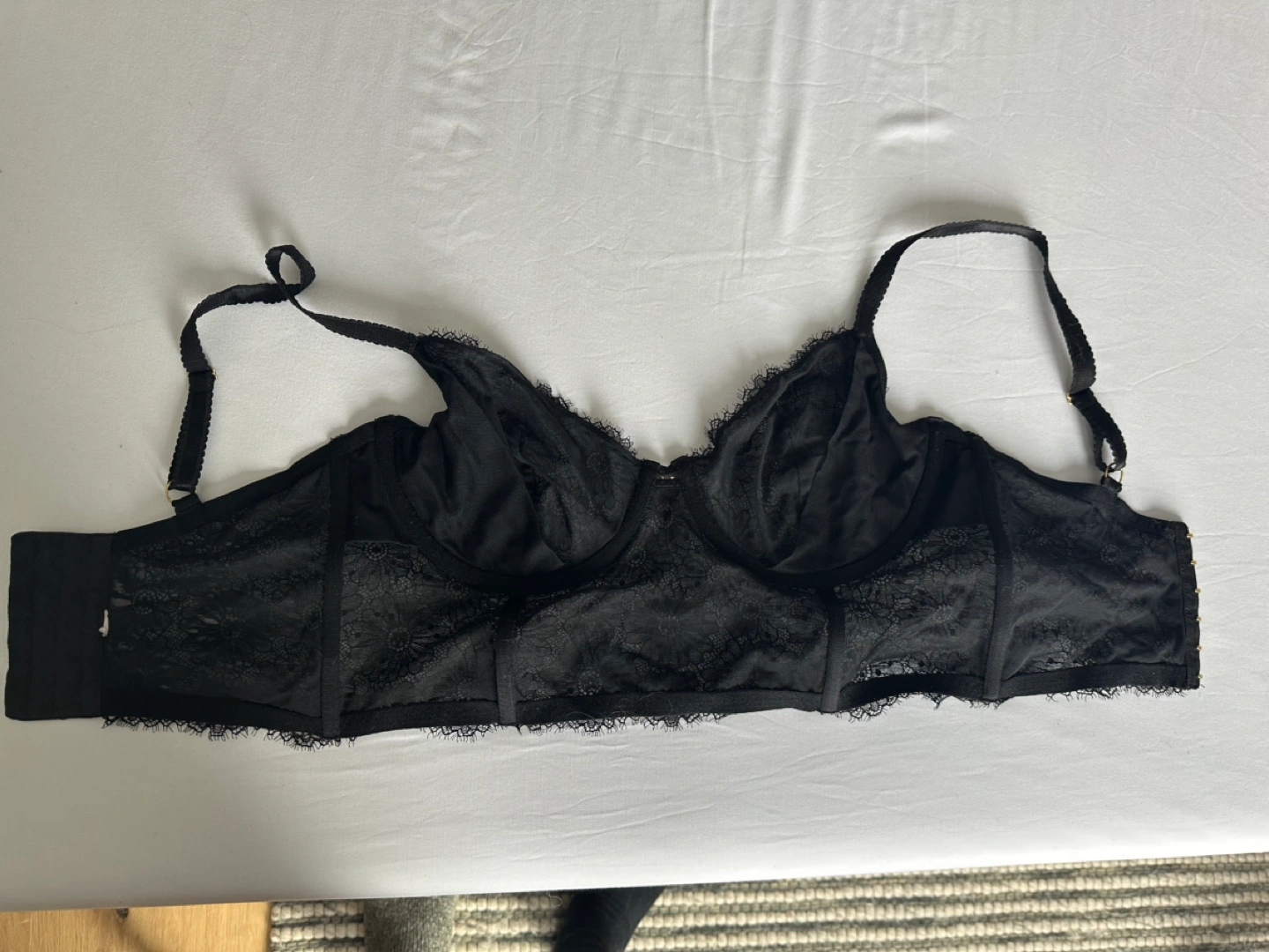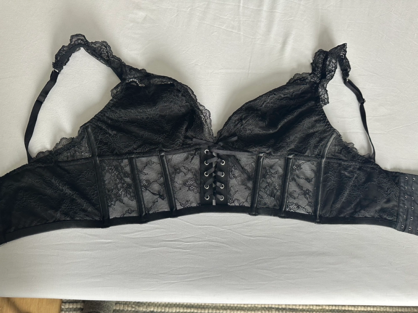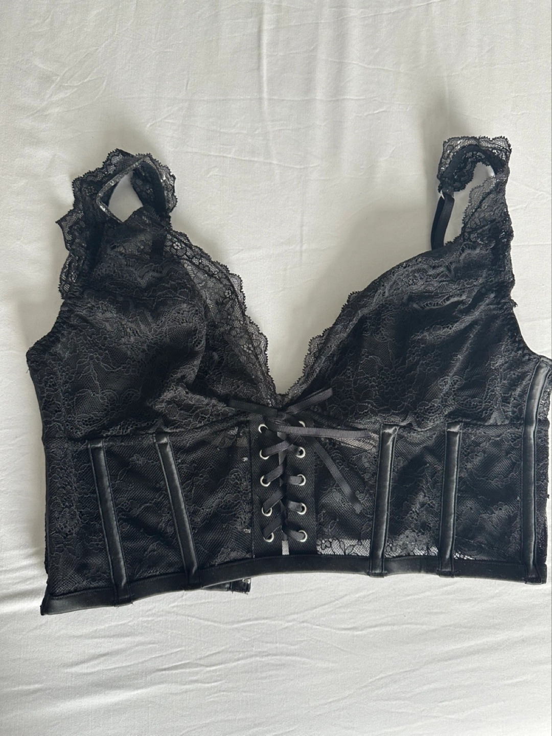 Black lace corset top. Features a front lace-up closure. Adjustable straps. Size Large.