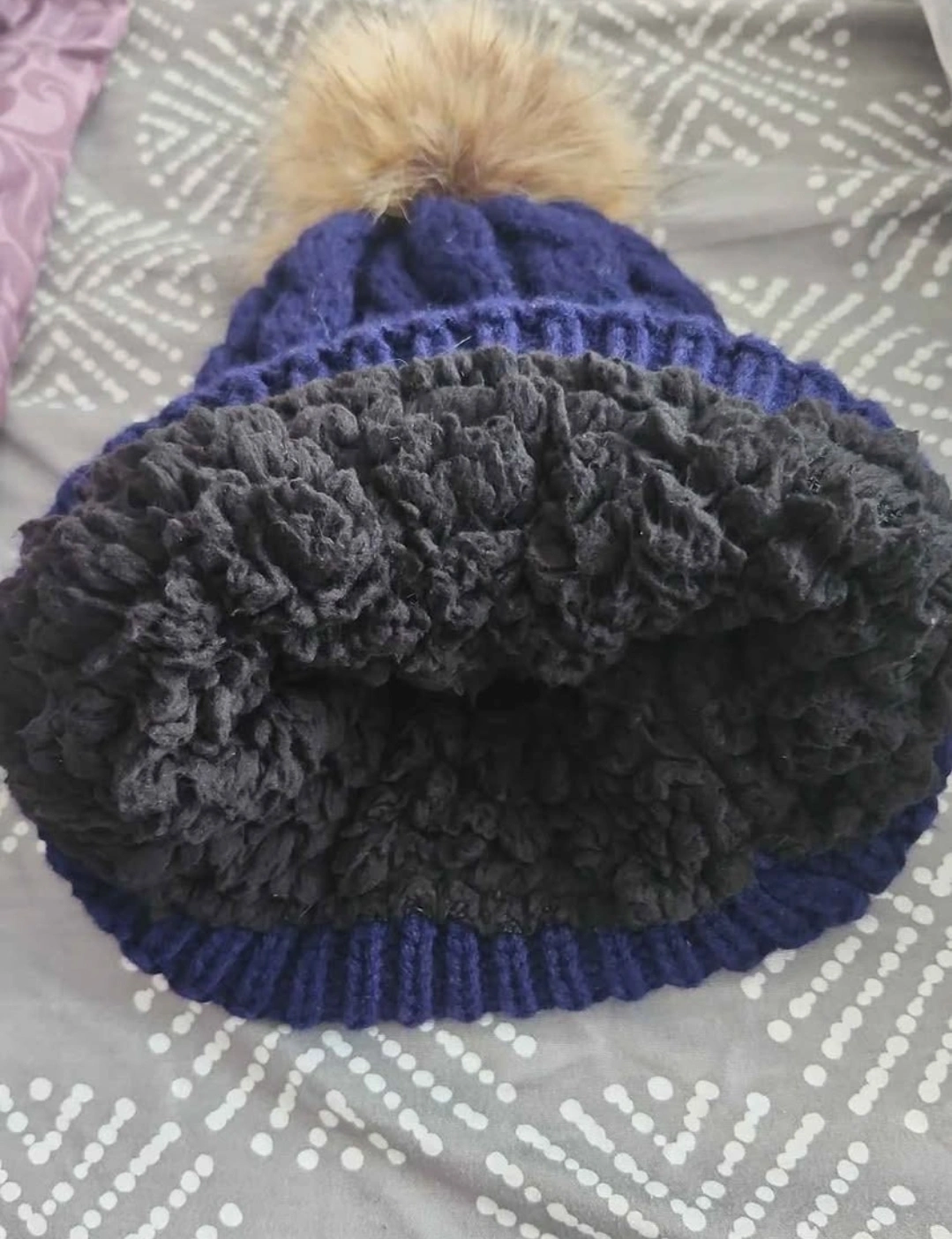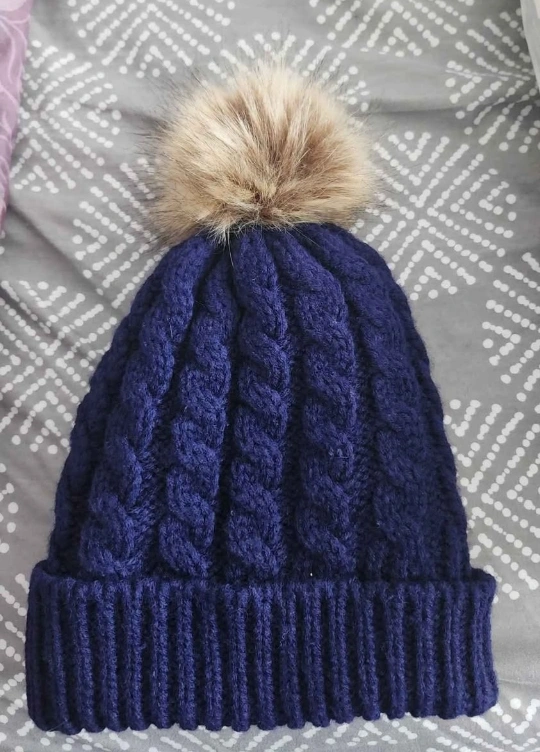 Warm winter beanie. Navy blue with a brown faux fur pom pom. Cable knit design. Features a fleece inner lining for extra warmth. One size fits most.