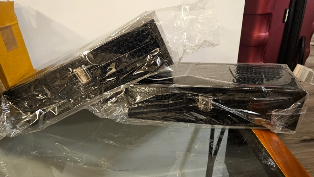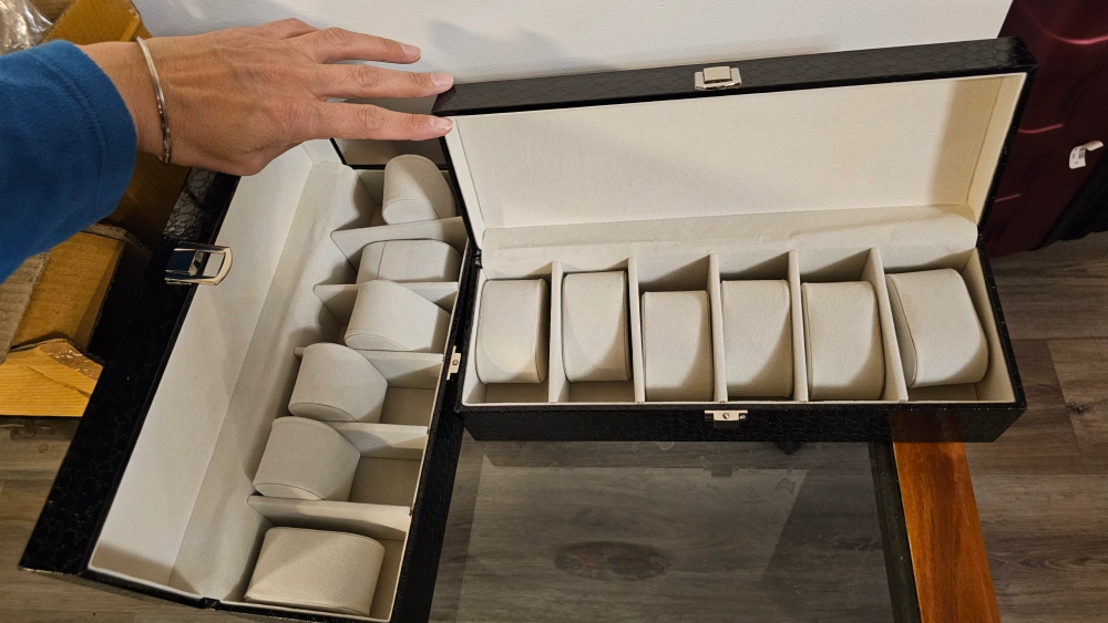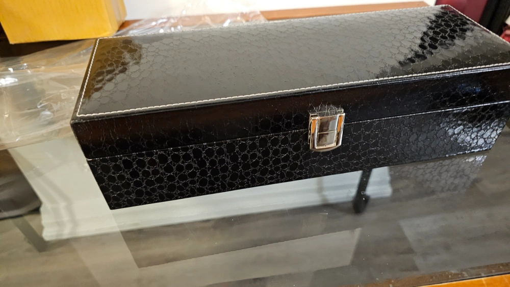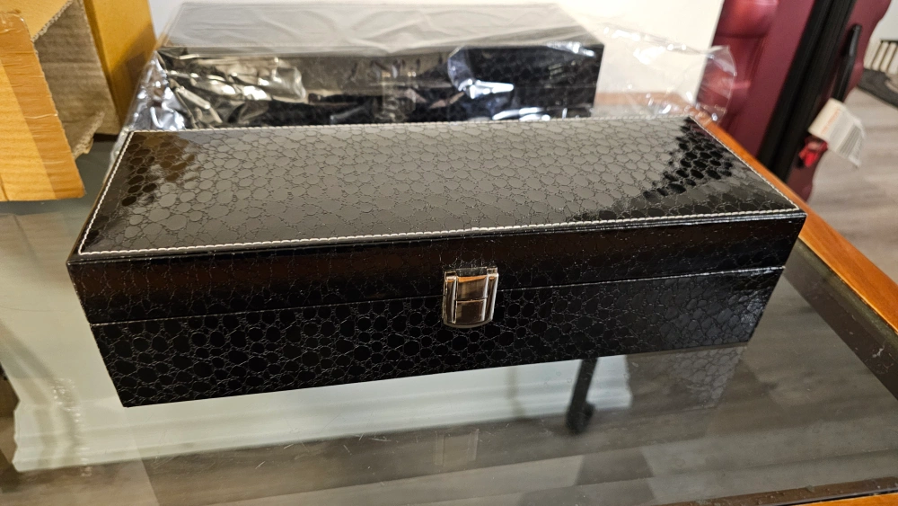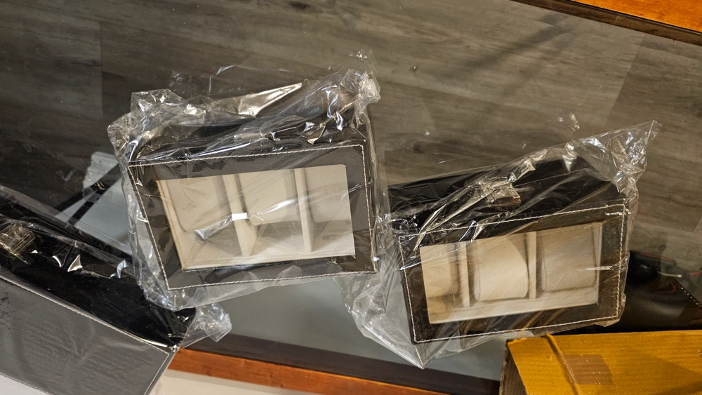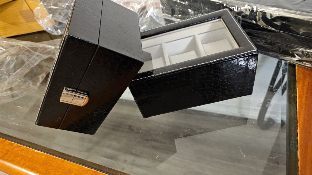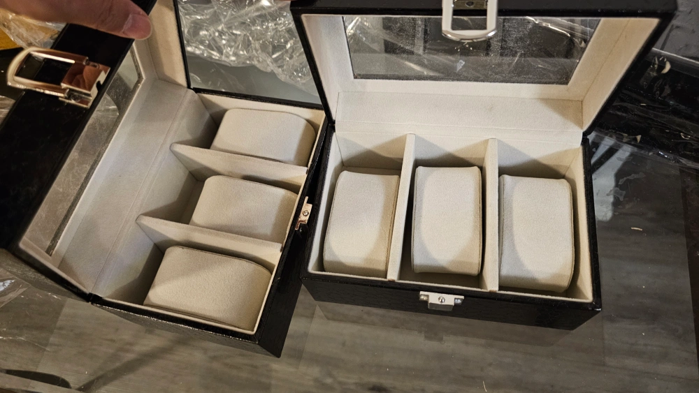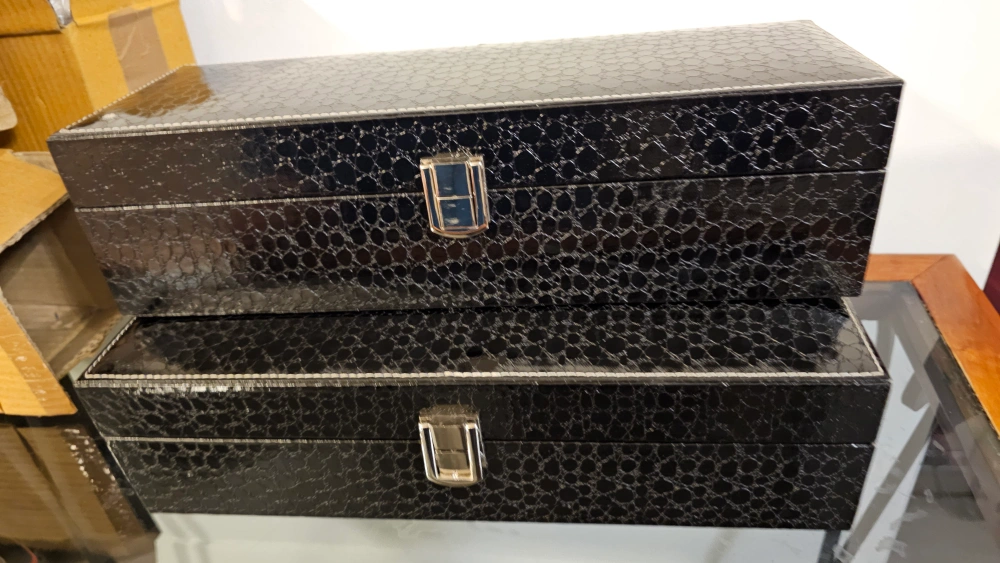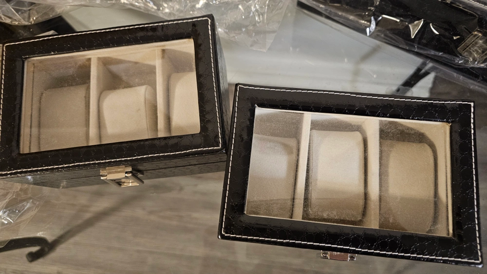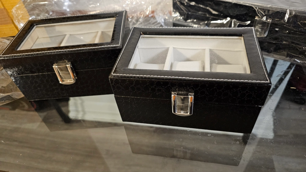 Set of two black leatherette watch boxes. One box holds 3 watches, other holds six. Features cushioned compartments and a clasp closure. Perfect for storing and organizing your watch collection.