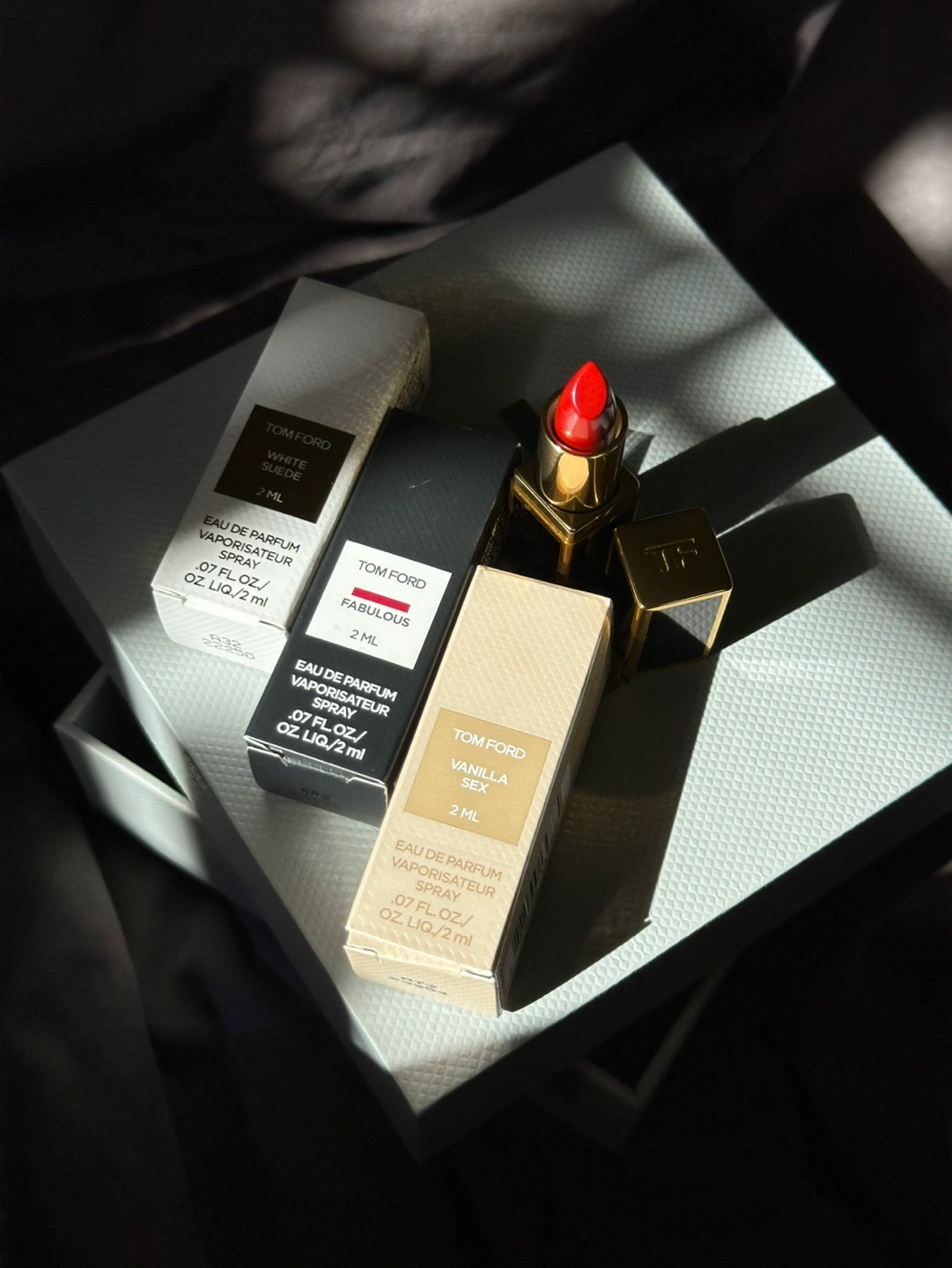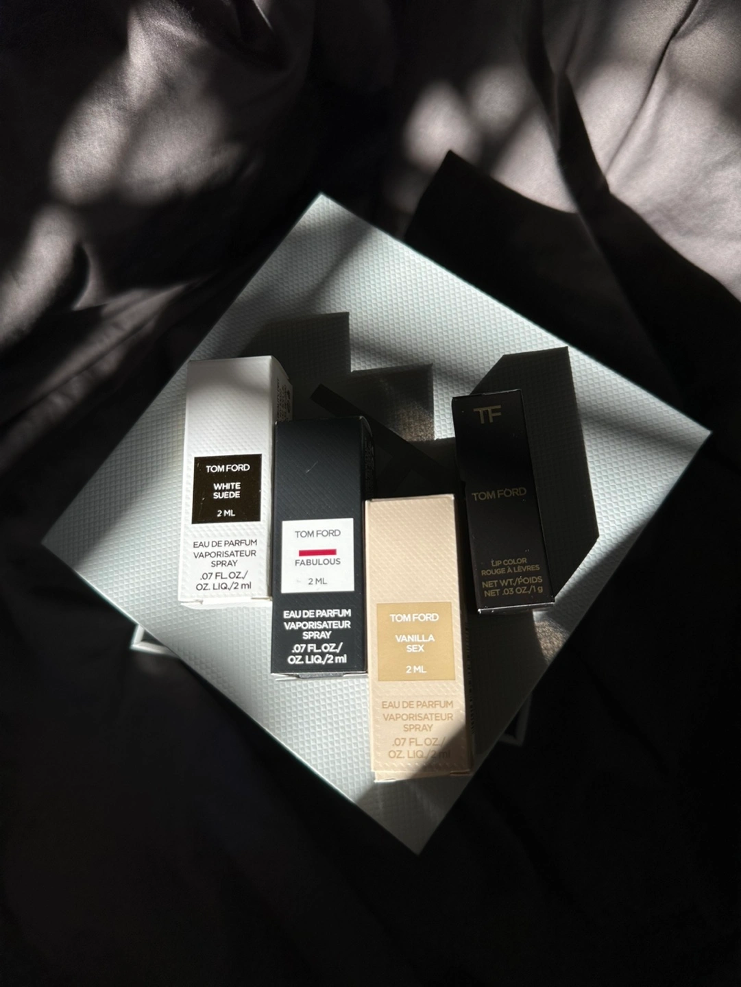 ➡️ NEW ✨ TOM FORD mini set - F Fabulous 2ml fragrance - White Suede 2ml fragrance - Vanila S** 2ml - deluxe size lipstick in ‘Scarlet Rouge’ 1g good if you’re like me and like to carry mini size in your purse *no gift box included in there ‼️$20 firm price