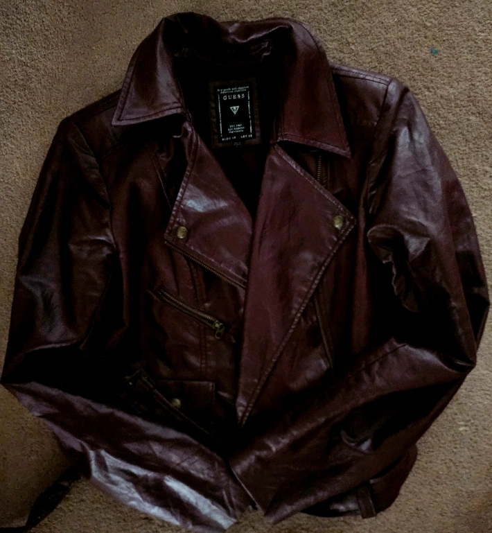 Women's burgundy faux leather jacket. Asymmetrical zipper closure. Multiple pockets. Size not specified, refer to measurements. Excellent condition.