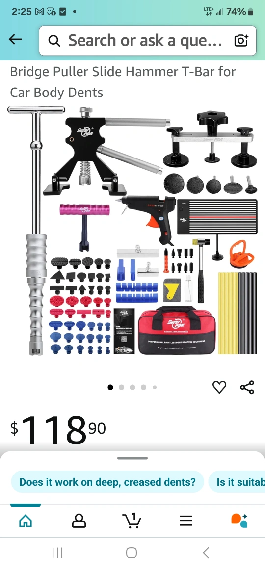 Complete dent repair kit. Includes bridge puller, slide hammer, T-bar, various sized tabs and glue. Comes in a carrying case. Professional quality.