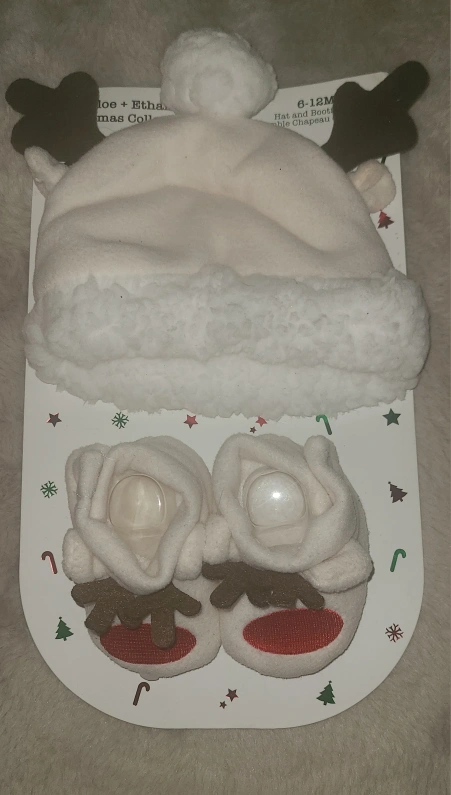 Brand new Adorable Christmas-themed baby hat and booties set. Soft, warm material. Perfect for holiday photos or a cozy winter outfit. Size 6-12 months. ♡Pick up only♡