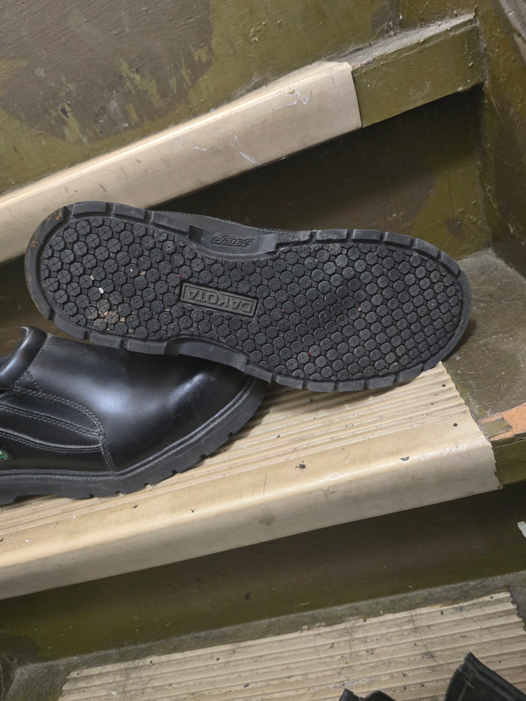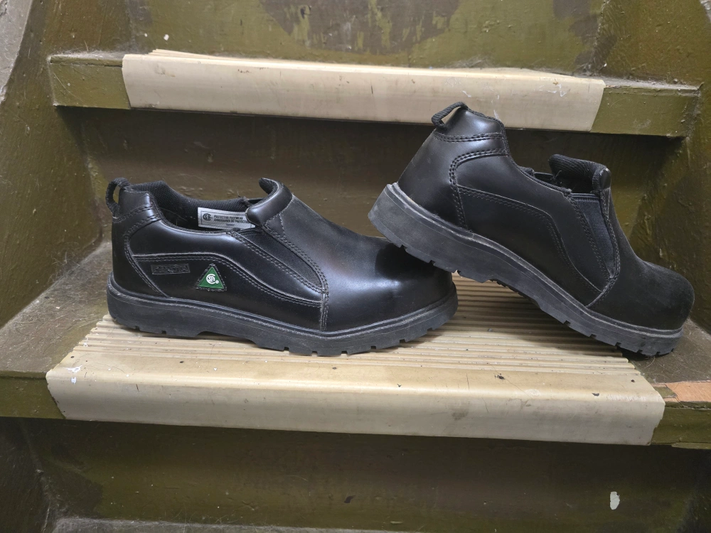 Pre-owned Dakota slip-on safety shoes. Black leather-like material. Durable rubber soles. Good for work or casual wear.