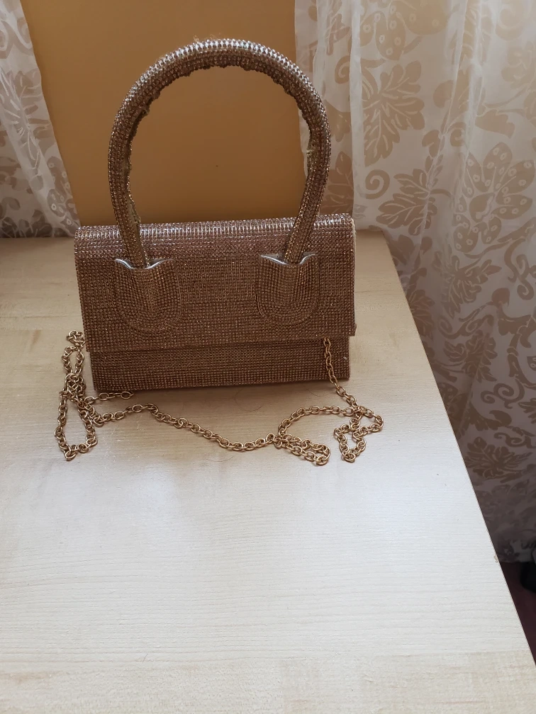 Sparkly gold clutch purse. Features a top handle and a removable chain strap. Small interior pocket. Perfect for evenings out.