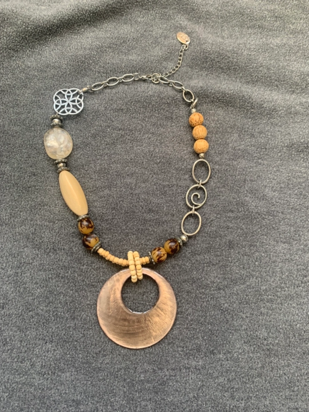 Unique necklace. Features various beads, metal accents, and a large circular pendant. Neutral colours. Great statement piece. Worn once.
