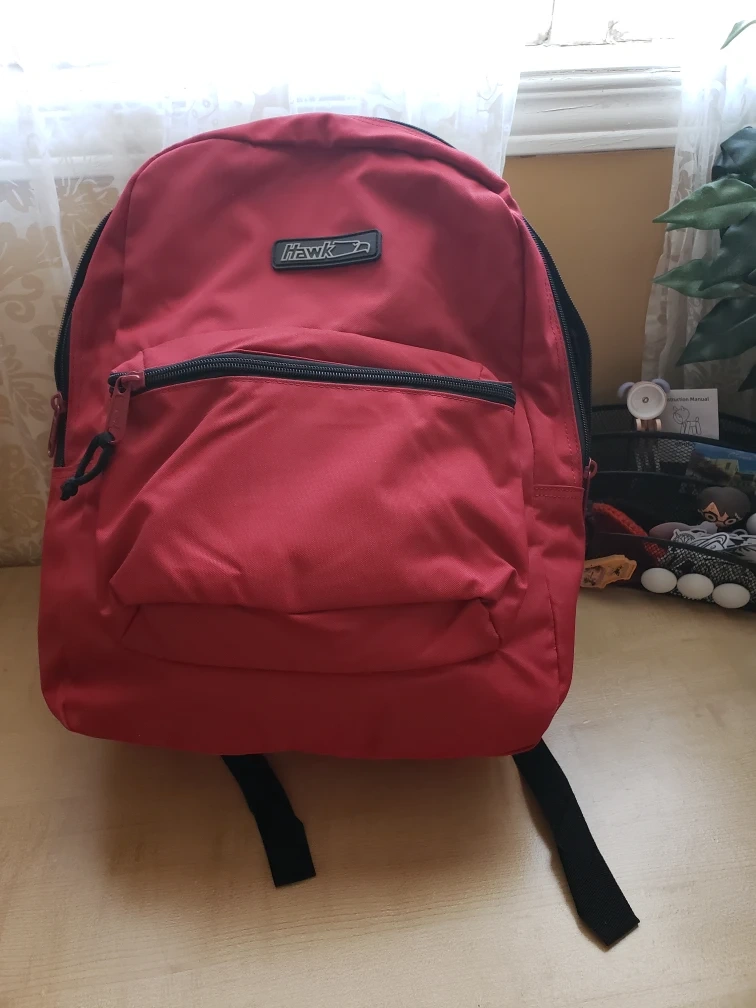 Red and black backpack. Features a main compartment and smaller front pocket. Includes antiviral technology. Durable and stylish.