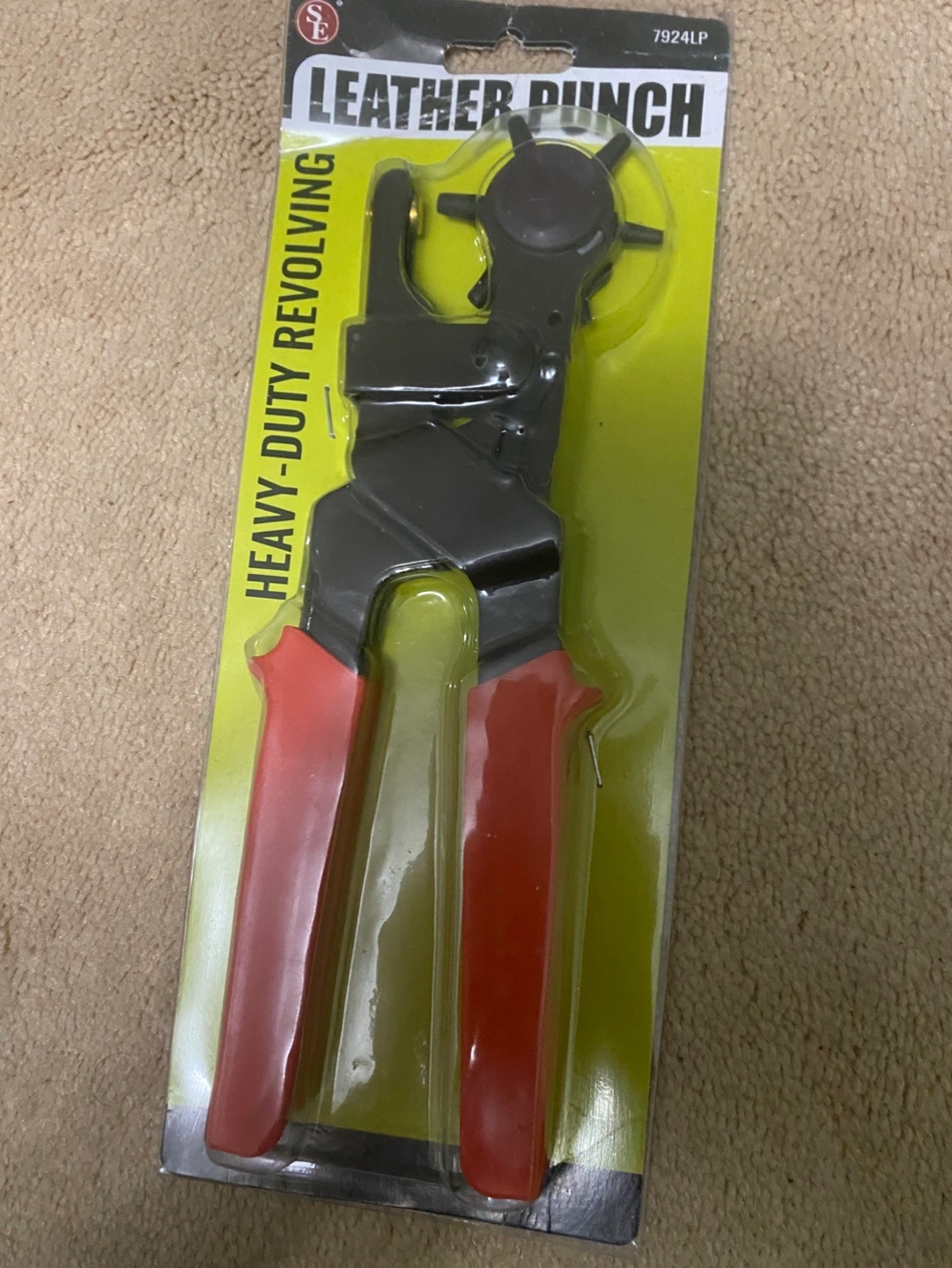 Brand new, heavy-duty leather punch. Six punch sizes: 2mm, 2.5mm, 3mm, 3.5mm, 4mm, 4.5mm. Brass anvil. Revolving punch head. Red handles. Instructions included.