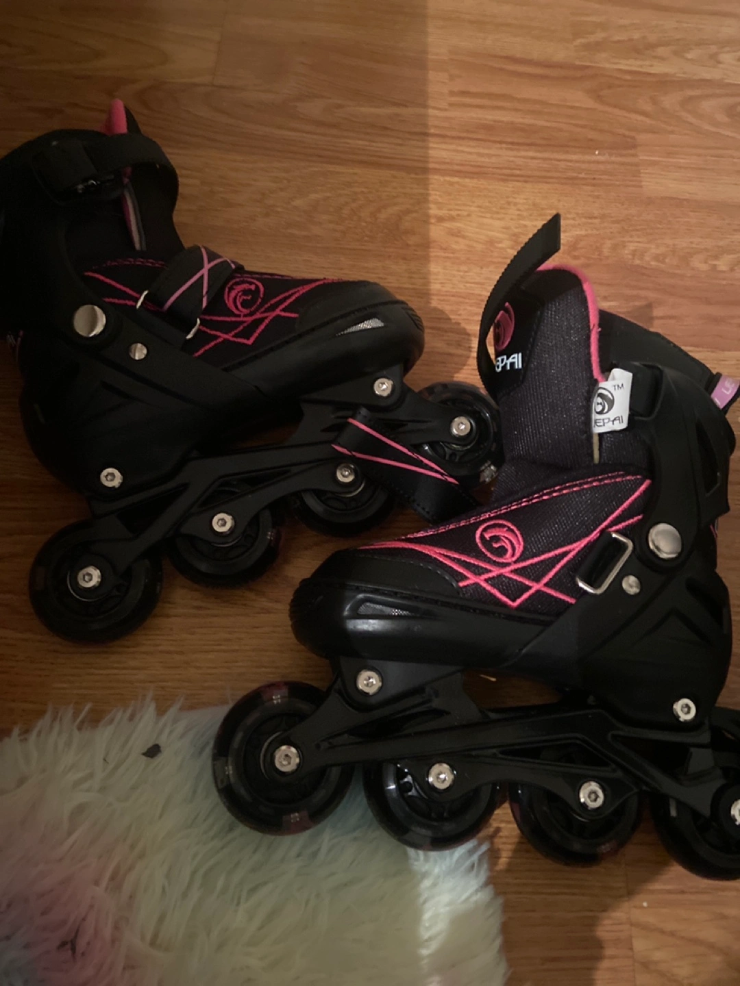 Pair of black inline skates with pink accents. Adjustable sizing. Good condition bought but have never used .