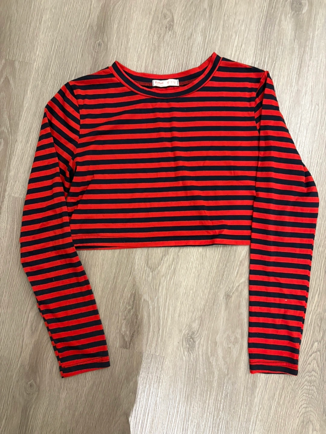 Cute cropped long sleeve top. Red and black stripes (the black is actually more like a rlly dark blue that looks black) Size small