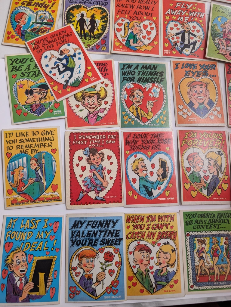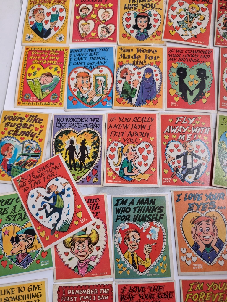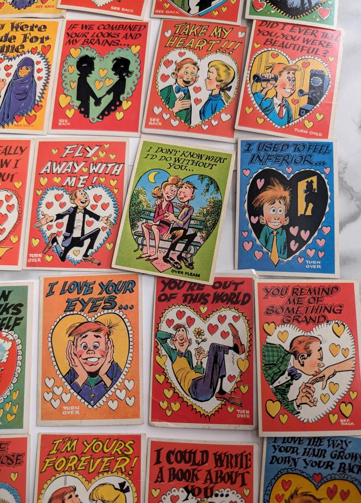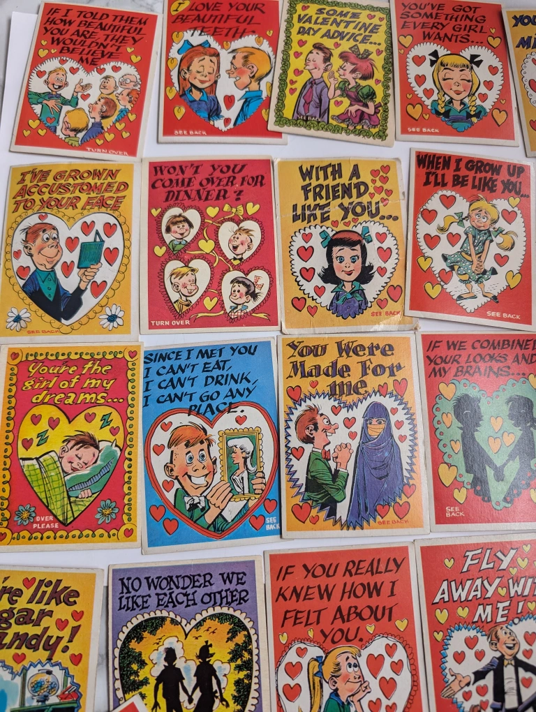 Large collection of vintage Valentine's Day cards. Features humorous illustrations and messages. Great for collectors or enthusiasts of retro ephemera. Cards show some age, but overall in good condition. ** Item is a product of its time, some messaging on cards may be offensive to some*"