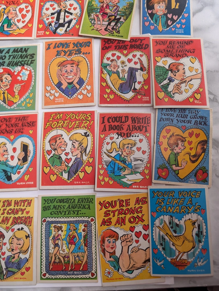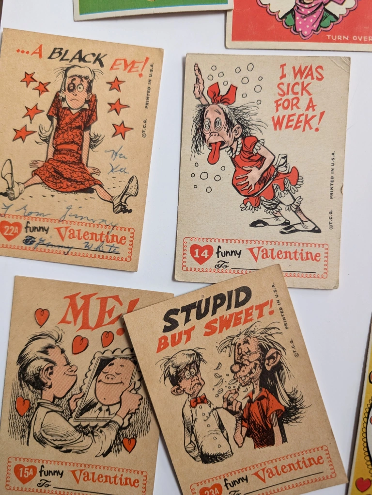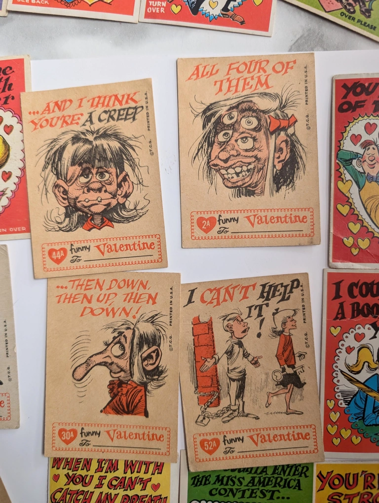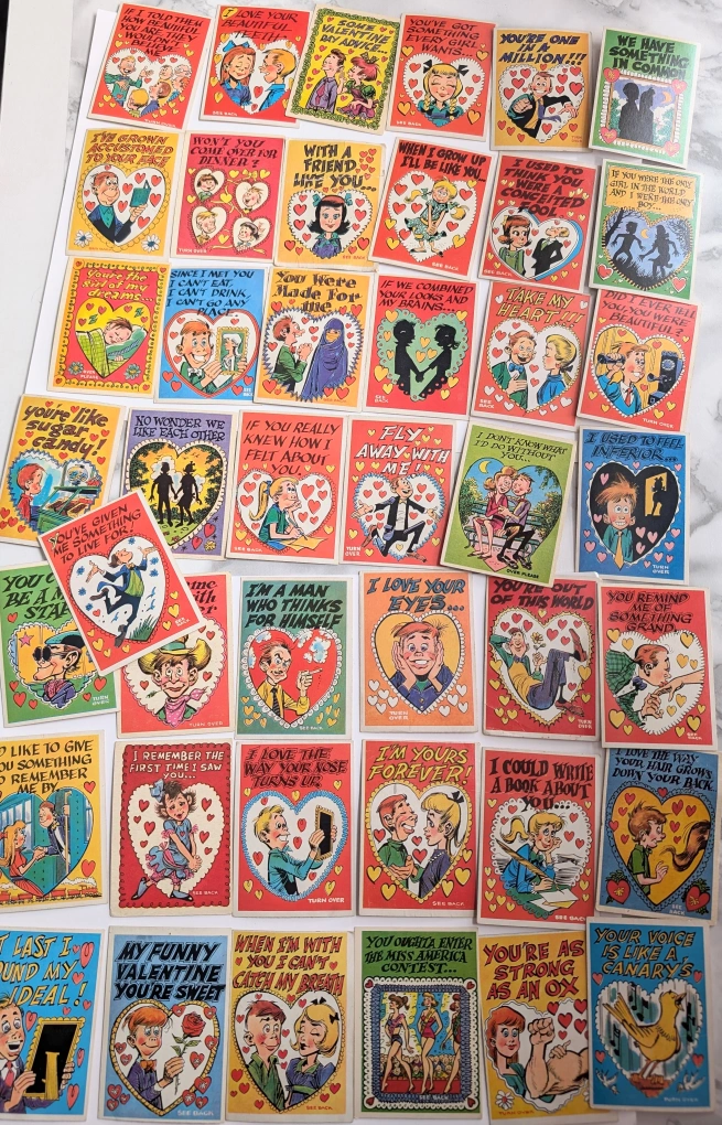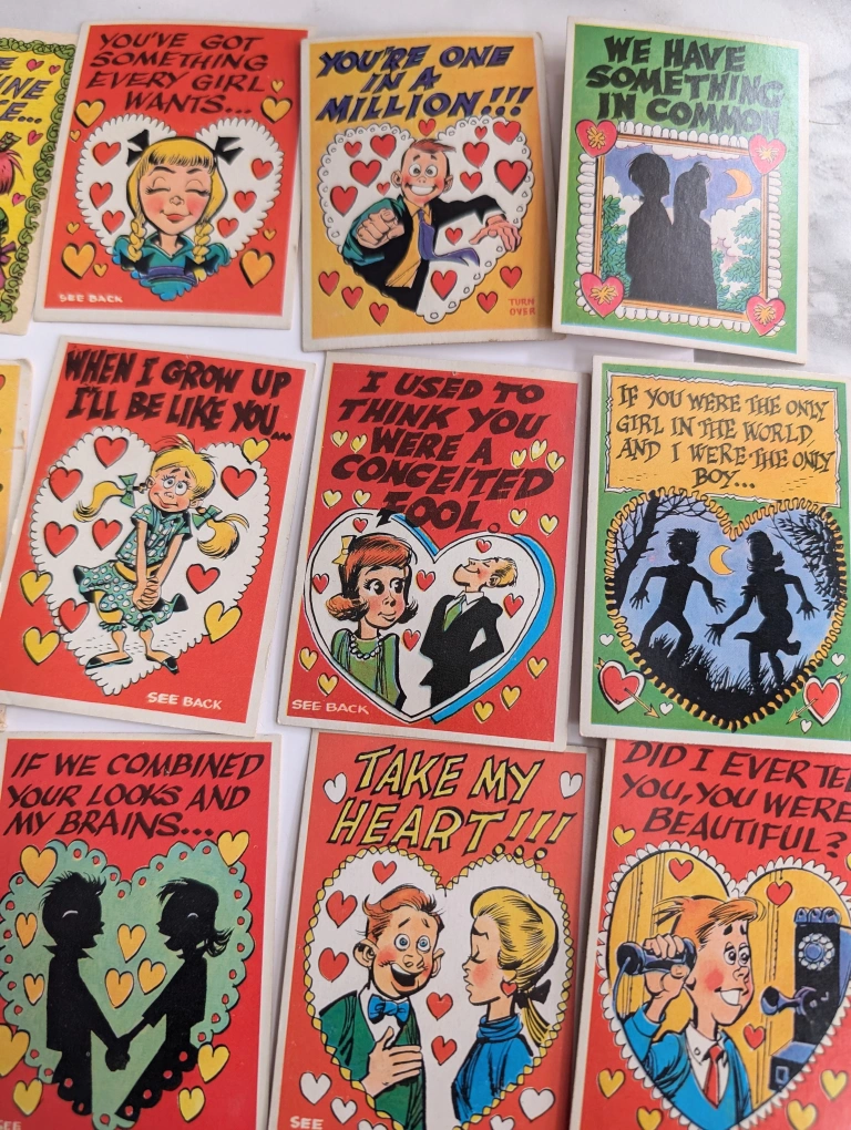 Large collection of vintage Valentine's Day cards. Features humorous illustrations and messages. Great for collectors or enthusiasts of retro ephemera. Cards show some age, but overall in good condition. ** Item is a product of its time, some messaging on cards may be offensive to some*"
