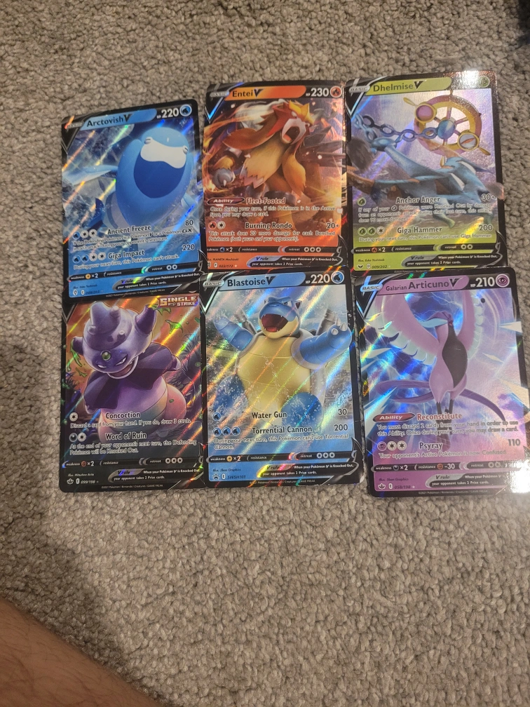 Lot of six Pokemon cards. Includes six V cards and energy cards. Great addition to any collection.