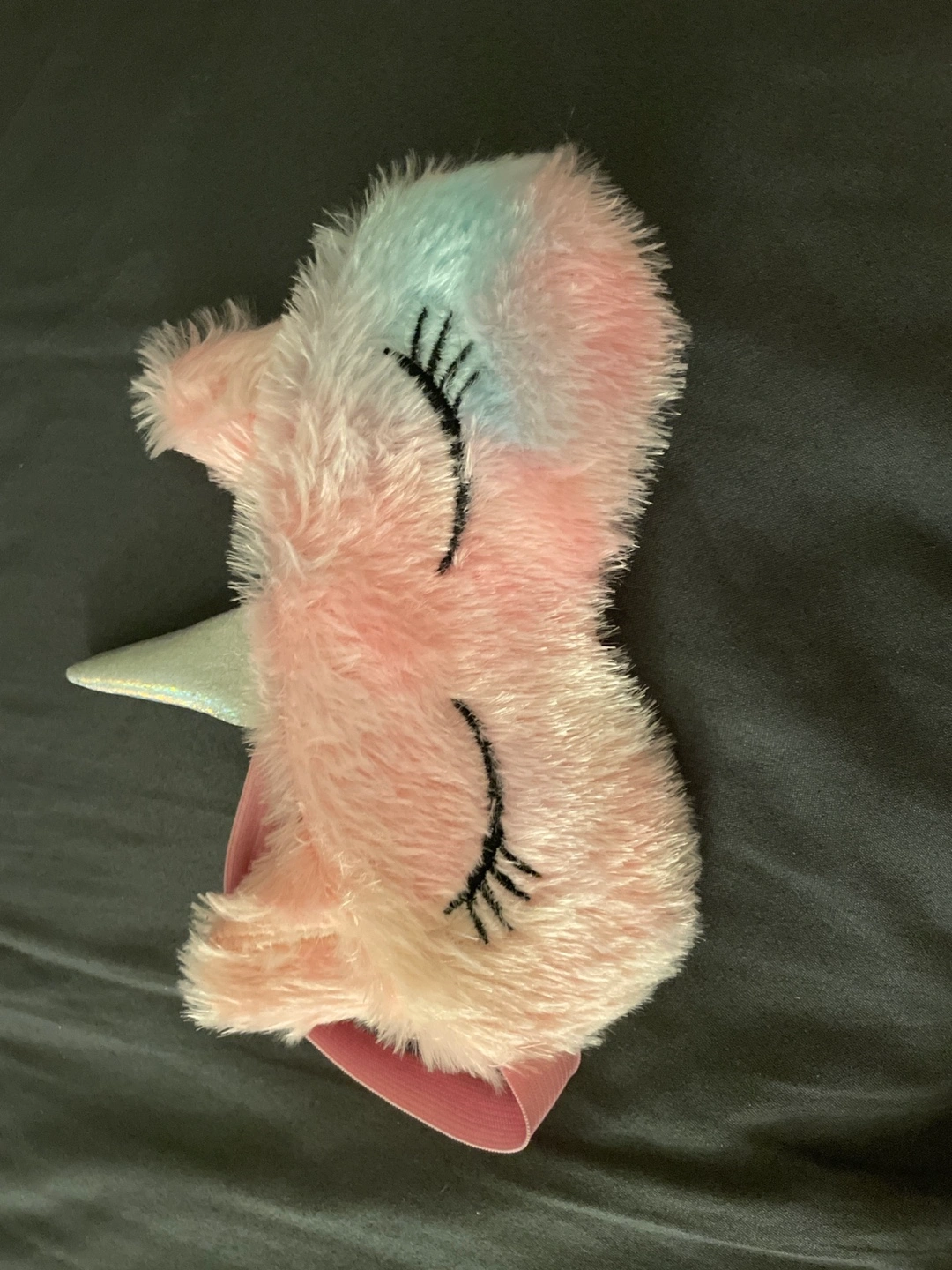 Pink and blue fuzzy unicorn sleep mask. Features embroidered eyelashes and a sparkly horn. Elastic band for comfortable wear.